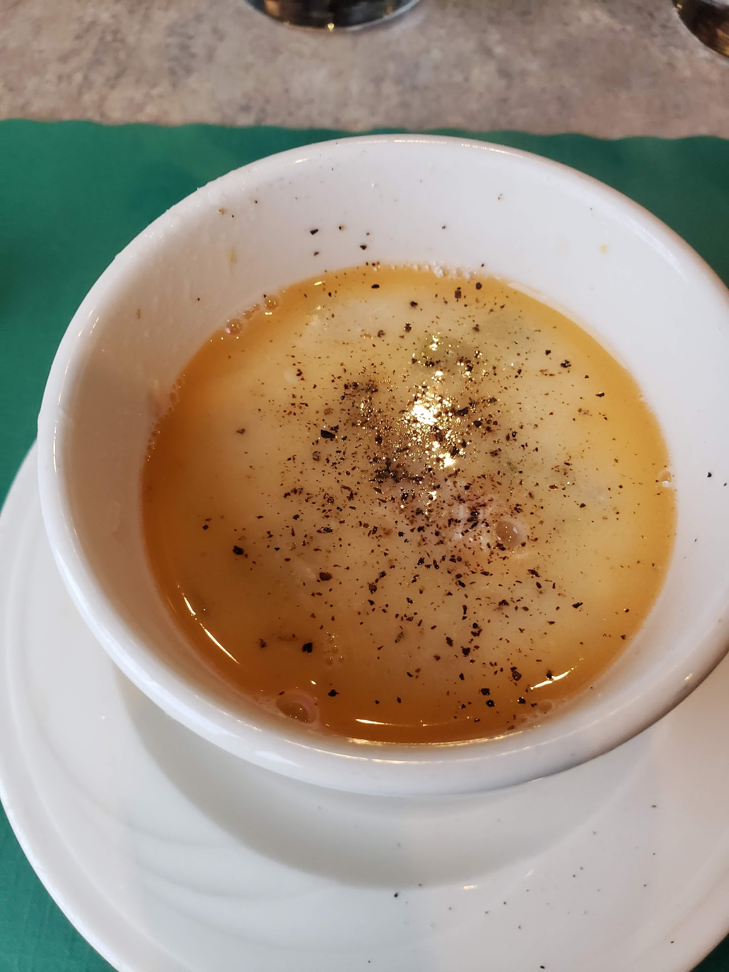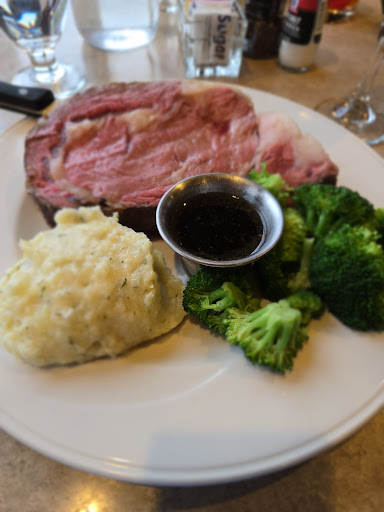We then looked to the menu, and that's where it got interesting. Another comment mentioned the Prime Rib on Saturday nights. Nope! No longer on the menu. The only steaks on the menu were 10 ounce Flat Iron steaks, with one done as in a Steak Diane Style (with mushrooms) with crostini with tomato. When ordering, we were told that they were out of Flat Iron, but that one of the employees went to the supermarket earlier and picked up Rib Eye.... but that there were only two left. Fine. I ordered the Steak Diane (medium rare) with a baked potato. Another dinner companion ordered the Chicken Parmesan, and was then told it doesn't come with noodles and that he had to choose a side. Options were baked potatoes, mashed potatoes, fries, sweet potato fries, and Cole Slaw. Nome of which are appropriate for chicken parm. (He opted for the Cole slaw). Two other companions ordered a shaved prime rib type sandwich with a horseradish sauce and came with potato chips.
