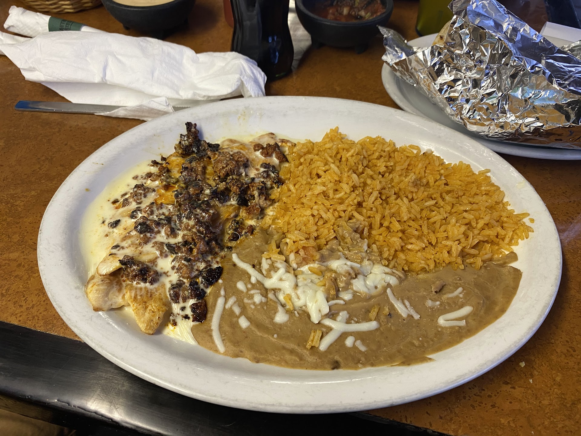 I ordered a pork burrito, as I often do, hoping the burrito paralleled the service I was already given. My party ordered the steak burrito, chicken enchiladas, Acapulco (sp?) enchiladas, and a chicken chimichanga. We chewed through three baskets of chips before our food came, but this isn't saying it took too long to arrive at our table (the dipping trifecta is SERIOUSLY good). A second round of margs came with our meal and the feast began.