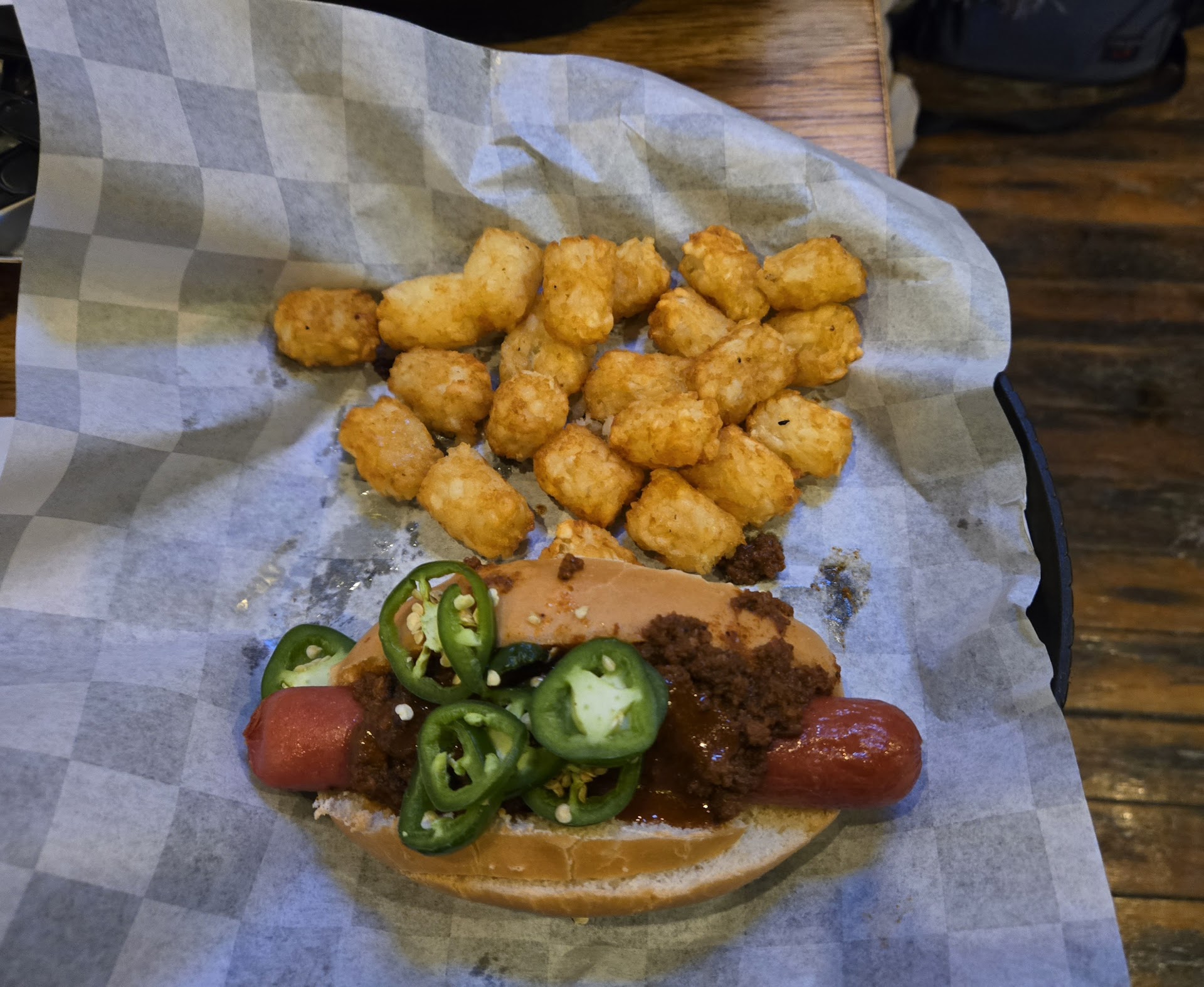 The atmosphere is bright and friendly, the place is clean and welcoming. They have a half dozen beers on tap, most of them from Millersburg Brewing Company. The menu is typical "bar" food with many of the items hot dogs or sausage sandwiches and other hand helds. I chose the fire dog. An all beef dog covered with coney sauce and ample jalapeños to give it some heat. Tater tots were crisp and not mushy. My friend had the meatballs and said it was pretty good. I enjoyed my time and...