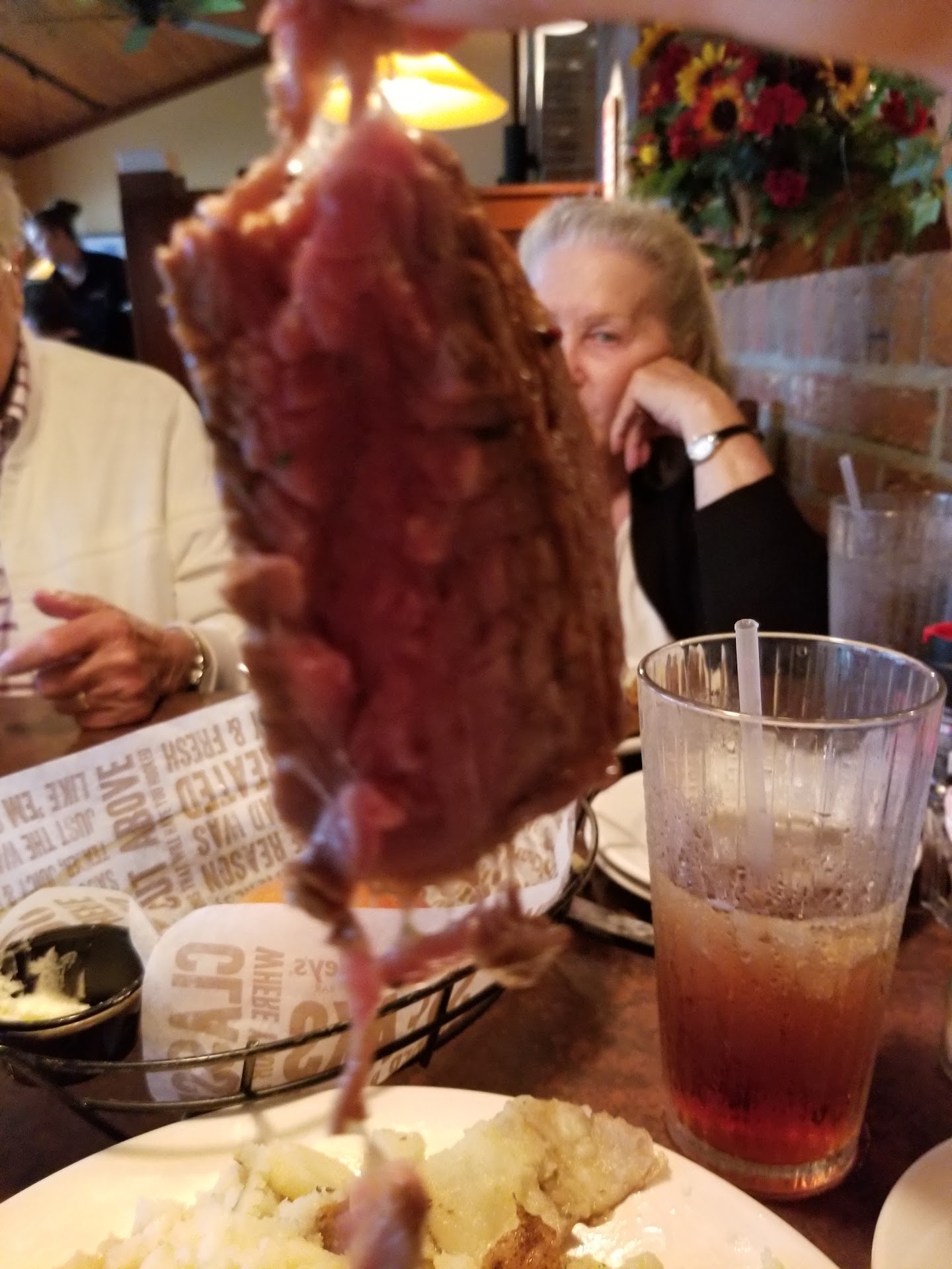 Read moreWe are here in Barboursville, from Ft. Myers, Fl. visiting our parents. My mom recommended O'Charley's for dinner, stating that the filet mignon could be cut with a fork and melts in your mouth. It had been 3 months since they had last visited, as O'Charley's charges $20.99 for a 7oz filet, and on a fixed income that is pricey. I very much looked forward to a medium rare, melt in your mouth filet with a baked potato with butter. That is not what I received. Not sure what the cut of meat was that I was served, but it was not a filet. Filets do not have sinew. My baked potato was still half raw. Mom ordered hers' medium well. They butterflied her steak, and it was dry and hard to cut with a steak knife. The manager remade our meals...after 20 more minutes of waiting...the second plates were just as bad as the first. This time, my "filet" pulled apart like a piece of rare pot roast. And they put only sour cream on the potato (hate sour cream on potatoes). Mom's second filet looked worse than the first, over cooked, butterflied and grisly. I gave up and left hungry. Hubby had tilapia, it was okay. I will not be returning to O'Charley's. If you go, don't order the "filet". You will be...