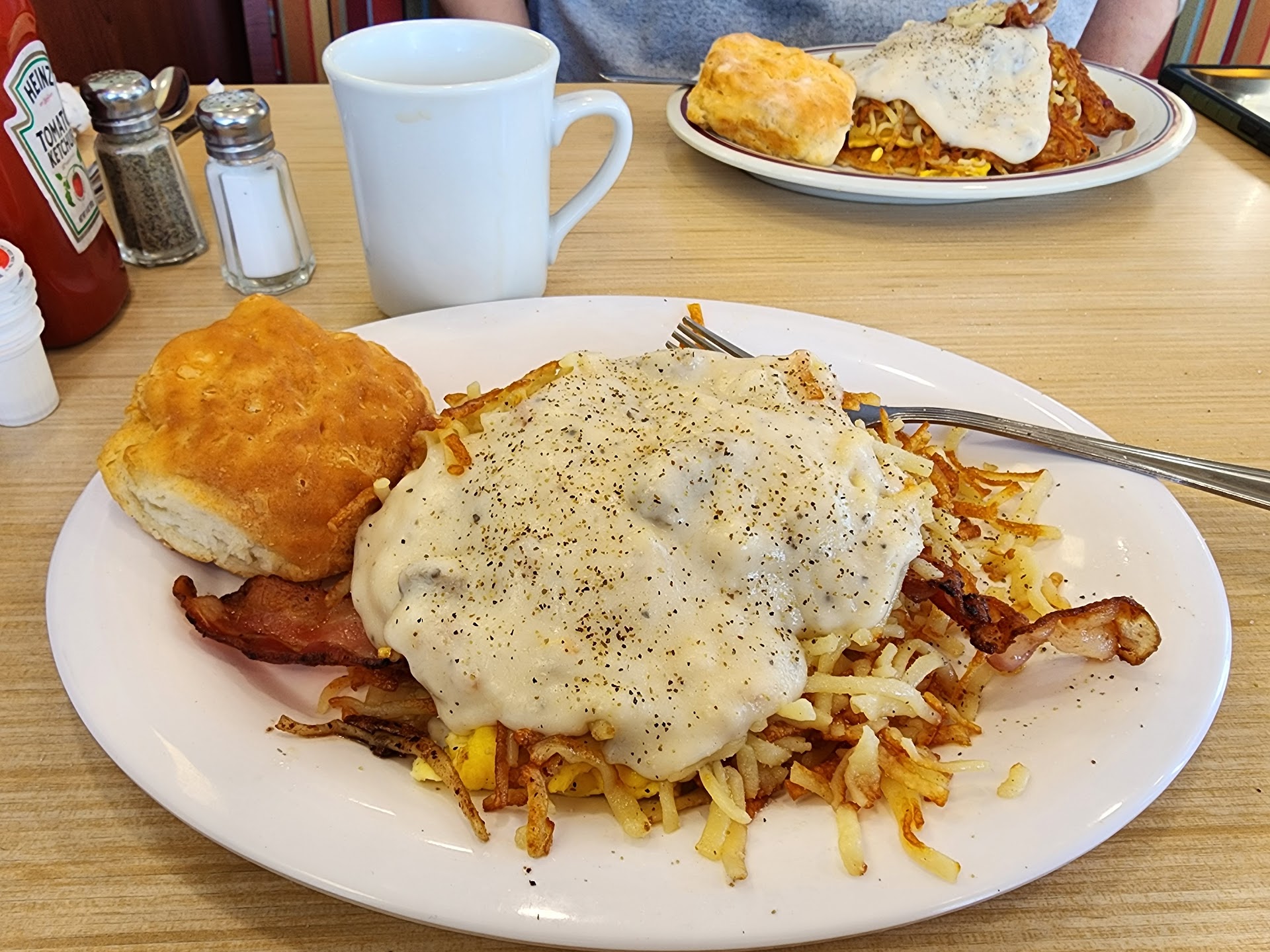 Ā Ā Ā Read moreVisiting the area for a burboun tour we decided to stop in and have breakfast first. Husband had the Meat lovers omelet & grits and I had Stuffed Hash browns with Sausage gravy and coffee. The reason for 4 starts if because of the service that or waitress gave. Brianna took a few minutes getting to us but then let us know that there were short staffed when the cook walked out leaving a person that was not trained as a cook to be their cook for the day. After Brianna my husband and I explained that we understood suggested that she take a few breaths and look at her situation differently. The people knew that they were down a cook and still decided to stay and eat, so it might take longer, your order might not be perfect, if they all knew this and still decided to stay it was on the customer not her. She gave every table in the place the best she had and we couldn't of asked for anything more. My husband's only came out with Pepper's in it. He never complained, She noticed the pile on his plate and promptly asked him if he could start on his grits so they could make him a new one. The improvised cook was great also he didn't know that they weren't supposed to be in there. Brianna and the person who got shoved into the spot as the Cook deserve applause for their hard work. Everyone makes mistakes and we all have bad days, We shouldn't be so fast to make a judgement. And Brianna if you happen to see this we were the table talking about the perfume & shipping...