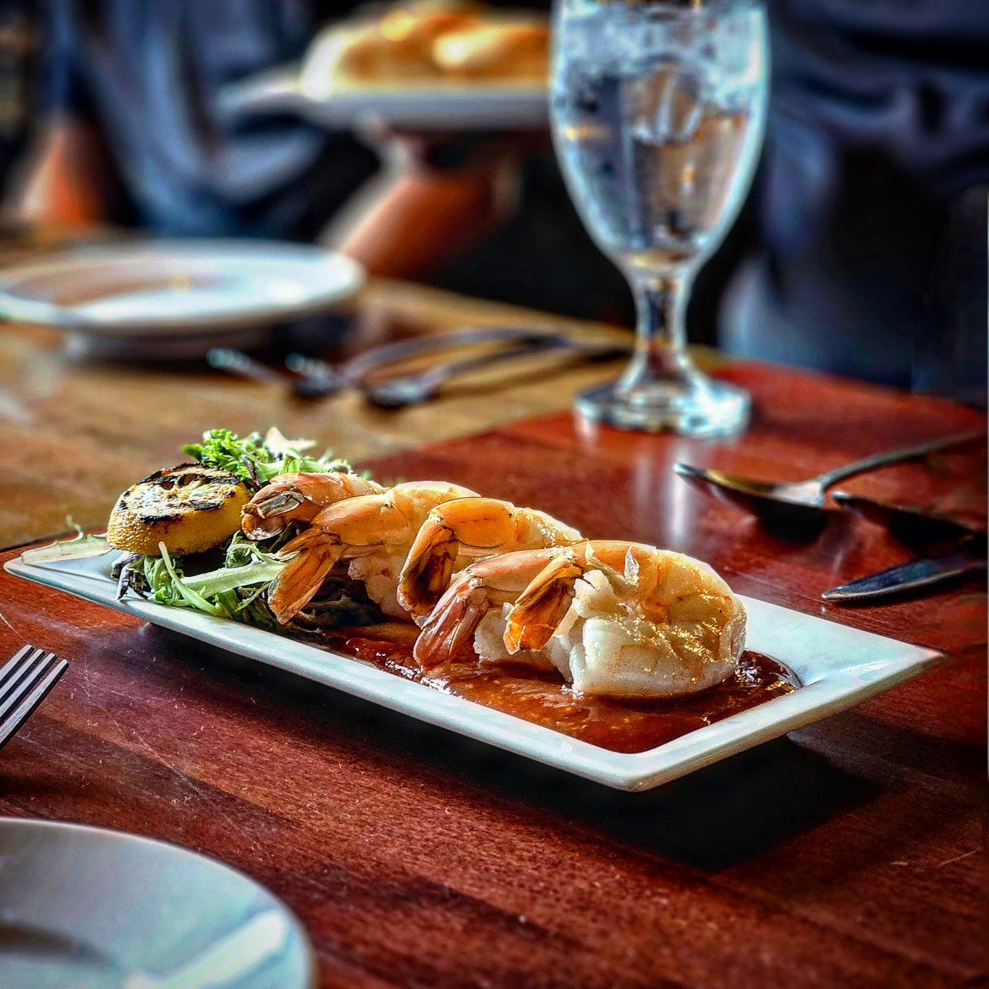 My wife and I ordered three items: shrimp and grits, the grilled Caesar salad, and steak linguini.