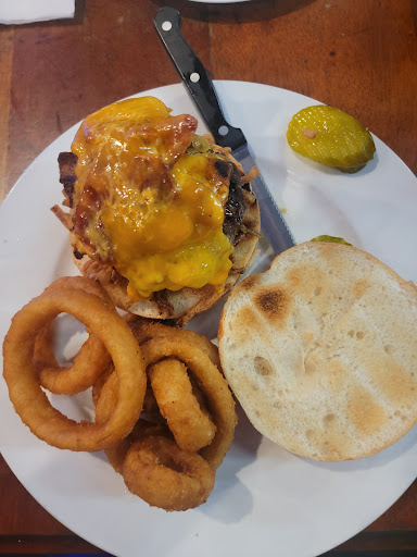 Fourth visit: Since noticing their Prime Rib Thursday neon sign by the road it's been on our list to try. Two of us ordered this for dinner, one medium rare and one end cut, and the third member of our party wanted to try the Angus Bourbon Bacon Burger he saw my partner eat on our first visit. The prime rib dinner was priced as in most restaurants @$33.75, more than we expected for a roadhouse, but it was seasoned perfectly and the sides of mashed potato with gravy and green beans with almonds were done well. A fresh roll comes with the meal. The burger was really enjoyed even though only half could be eaten. Our fellow diner pointed out how much bacon came with it.