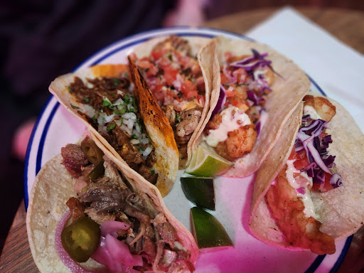 Now, onto the star of the show: the food. I started with their famous birria tacos, which honestly lived up to the hype. I also tried their al pastor, which had that perfect balance of smoky-sweet flavor . The carne asada taco had beautifully seasoned steak, cooked just right with a little chew and a lot of flavor. My absolute favorites were the fish, shrimp, and chicken tacos — seriously, I’ve never had that much flavor packed into one bite. Each one was seasoned perfectly, like someone really took their time getting the balance just right. The fish was crispy and fresh, the shrimp had this juicy, slightly smoky flavor, and the chicken? Super tender and loaded with spices that hit all the right notes All the tacos came topped with finely chopped onion and cilantro, plus lime wedges and two house salsas on the side — a mild verde and a smoky red with some real heat.