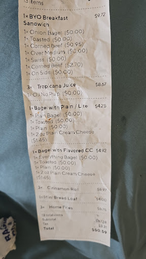Read moreOrderd delivery I had to wait an hour and a half and I paid $50 for two bagels with plain cream cheese and two orange juices.! They forgot almost my whole order! I can't even believe it. After waiting an hour and a half and paying $50 for no breakfast! I don't understand how someone could even do that? I can understand if you forget to put a couple of cream cheeses in the bag or maybe if you're busy you forget to throw in one bagel.. but to forget an entire breakfast meal plus two cinnamon rolls and mini bread loaf and an order of home fries!! Huh? Then charge me over $50 and only deliver two bagels and a oJ! We also put our order in at 10:45am the two bagels didn't show up till 12:15 p.m.!? What is happening.? What a disappointment and a waste of money!