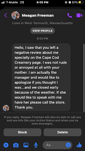 There is no argument or discussion about what happened because you will obviously keep defending your crew. I am doing my part by posting an accurate review on what happened and how both of your customers experiences were. I was going to post a great review until I heard how Meagan assisted my mother. And please let your employees know not to message me privately on Facebook, extremely creepy...