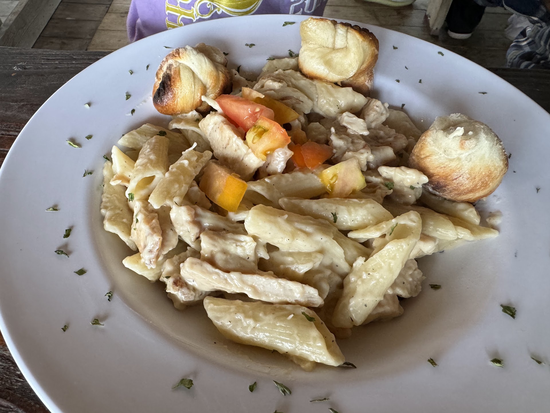 Nuestros platos llegaron a las 2:10 p.m. Tardaron más de una hora y el lugar no estaba lleno. La presentación de platos es bonita. Respecto a los platos: (1) la pasta estaba sobre cocida, tenía poco pollo y poca salsa -la salsa sabe exactamente a una del pote al sartén, no le dan nada de cariño-; (2) las porciones de pechugas rellenas son pequeñas, los tostones son sumamente finos (no era ni medio plátano), la ensalada van del bolso al plato, tal cual con algunos tomates “cherries” encima; (3) las salsas NO son salsas, una es solo la misma Alfredo de pote -también sin cariño- y la de guayaba es solo pasta de guayaba con algo de agua -ambas estaban frías de nevera-.