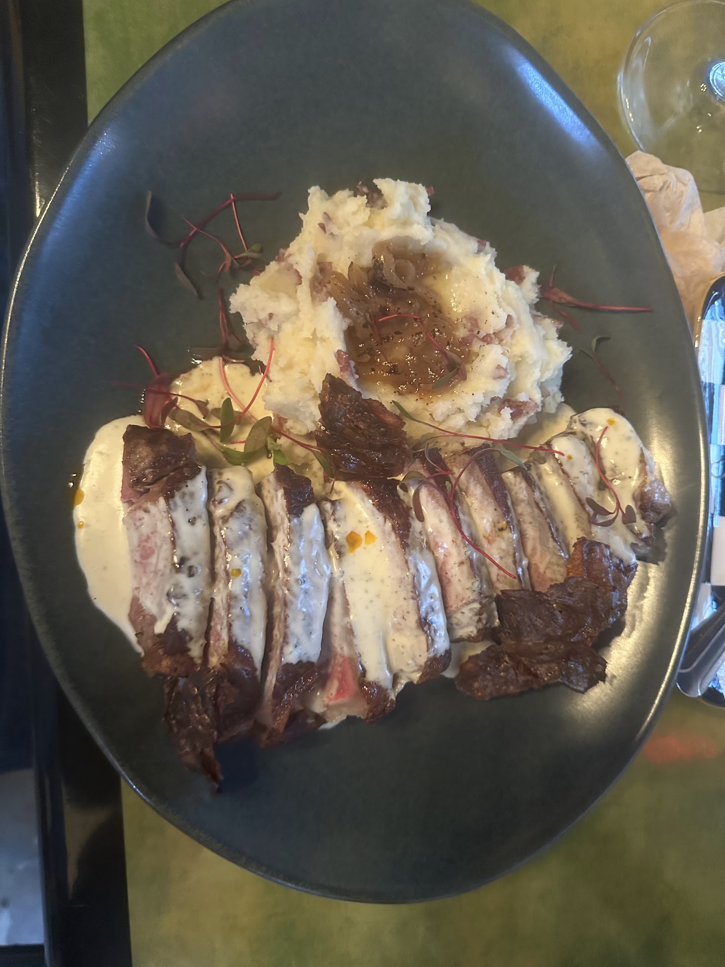 WOW! No hay palabras, entramos y esperábamos un restaurante criollo del montón, pero q equivocado estaba. Nos trajeron el menú y que increíble mezcla creativa de ingredientes. No sabíamos ni que pedir y lo mejor es q cambian el menú semanal. Para empezar un fondeu con longaniza y chips de la casa, a porción es como para 6 personas y muy bueno. Pedí algo básico, un NY steak medium y papa majada. Increíble q la papa tenia creo q jengibre q le daba un toque espectacular y la carne en su termino. Mi papá pidió chuletas de cordero y su plato estaba esquisto y la porción muy buena. Mi madre pidió Manicotta ricotti de espinaca, de igual forma bueno y buena porción. Al final pedimos un postre q era una mezcla de cheesecake de manchego con pudin, flan y blueberry q era una explosion de sabores dulces. En fin muy recomendado ya quiero probar q van hacer la semana q viene ya q cambian el...