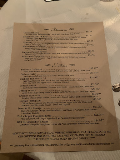 She and I ate here on the last night of a brief excursion into the area. We did quite a bit of research on restaurants in the area and were grateful to have found this place. The food was FANTASTIC. Service was friendly and attentive. We started with the soup-of-the-day, a New England clam chowder, which was frankly the best I've had in my life (and I grew up near the ocean in Rhode Island). Then followed by a great salad of mixed baby greens, blueberries, strawberries, walnuts, with a very nice (not to sweet) poppy-seed vinaigrette (their house dressing if I remember correctly), and then followed by the lobster ravioli (which again was one of the best I've had.) We ordered some Clam Chowder to go as well.