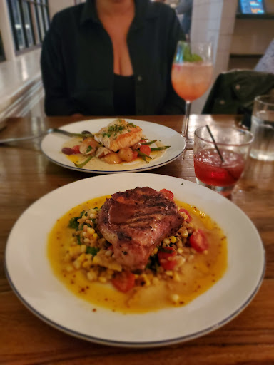 UPDATE 8.19.23: We came back for a second go around and boy are we glad we did. It was a busy night and the kitchen was a smidge backed up but that did not deter from the amazing experience we had. My husband had the Bone-in Pork Chop again and it did not disappoint. He usually gets a doggie bag when we go out but his plate was wiped clean tonight. I had the Salmon and it was cooked to perfection. The sauce/gravy that accompanies it with the potatoes, green beans and tomatoes was so delectable. I sopped up any extra gravy with my bread. We accompanied our meals with the Blueberry Mule & the Strawberry Rose Fizz. Margaret served us this evening and she was excellent. She gave us water right away and after we ordered and she brought our drinks, she let us know the kitchen was a little backed up. She continued to check on us and provided exceptional service. I've updated my review to reflect my most recent experience and I'm sure the experiences that will come in the future. (Pics from this visit)