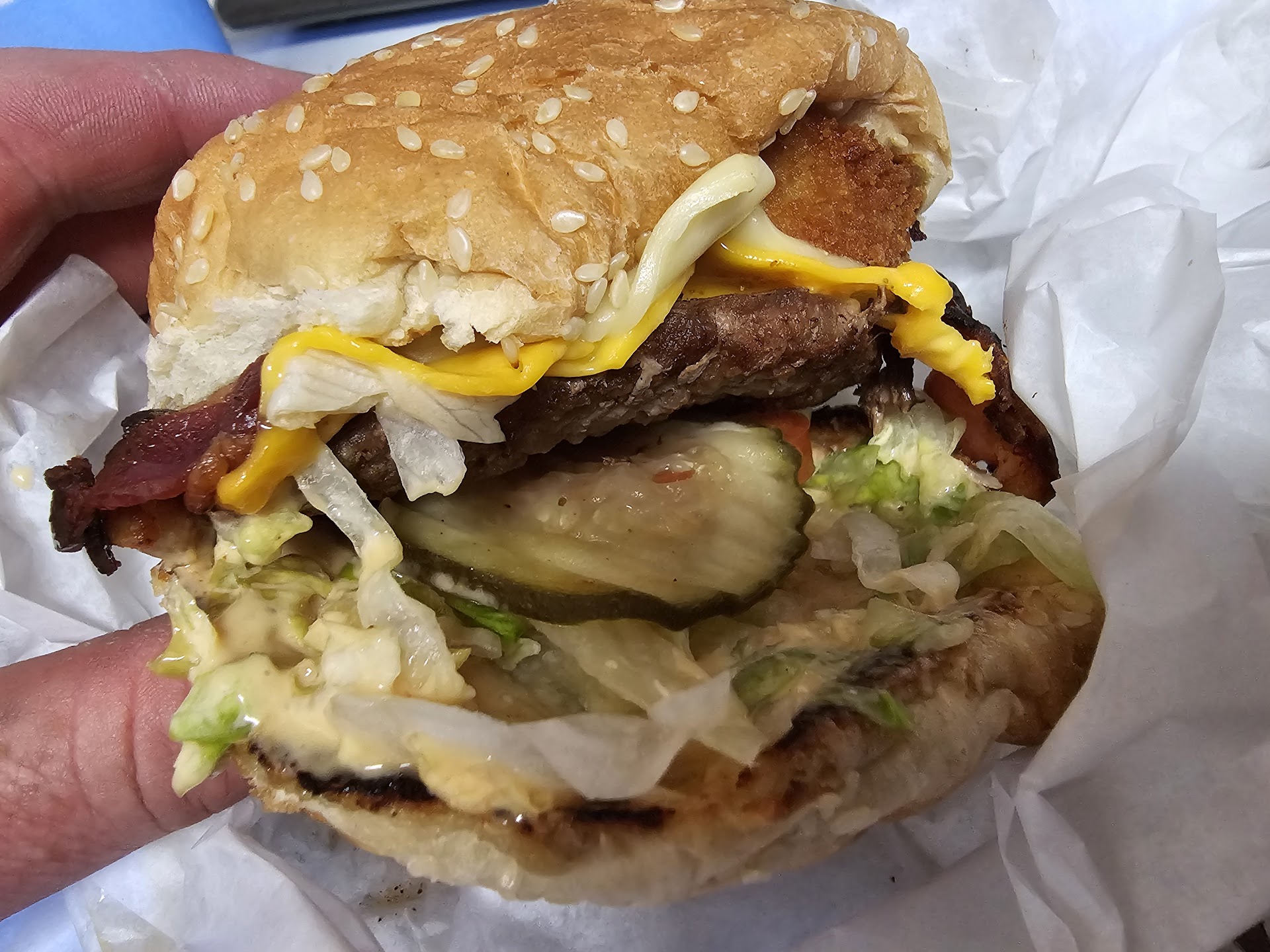 I ordered a turkey burger with swiss cheese, extra lettuce, extra onions, extra pickles, extra tomatoes with ranch — no bun — they made me a healthy alternative.