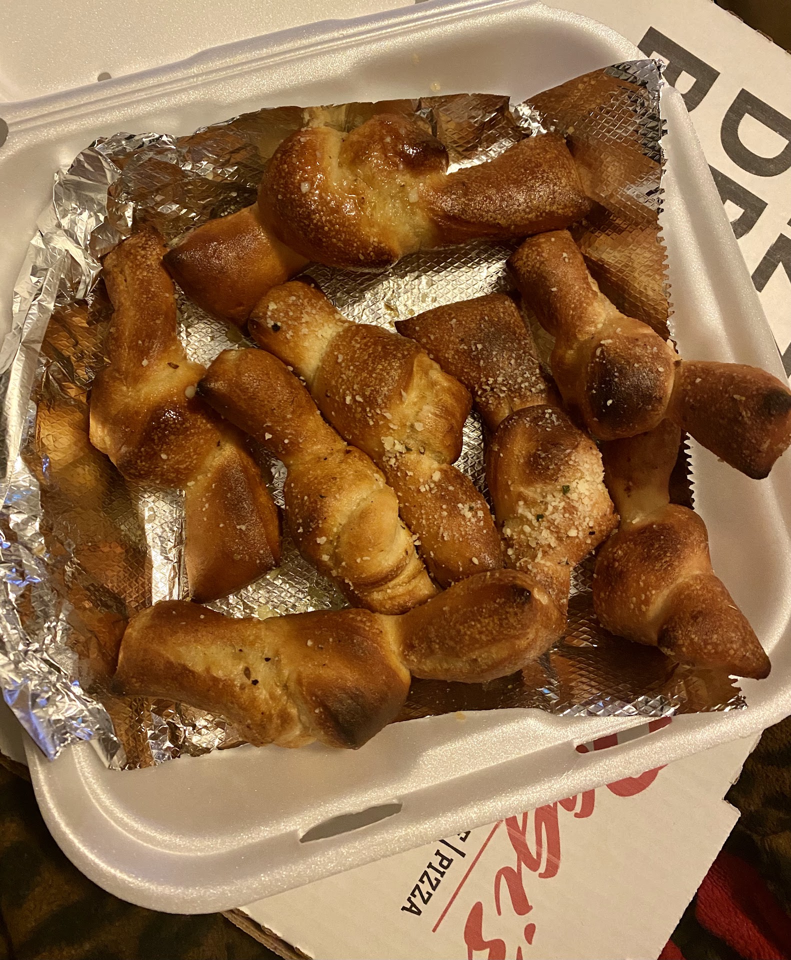 We ended up taking our food to go, and when we got back to our campsite, the garlic knots were horrible and the pizza was just not very good. Now I will tell you it did take us about 10 minutes to get back to our campsite, we were off of Hodge Road, about 3 miles away, one of my kids actually said I donât think they gave us the right knots because I donât even taste the garlic. The pizza was very blah and a family of four did not even finish half of the large pizza the next day nobody wanted leftovers. We ended up throwing it away.