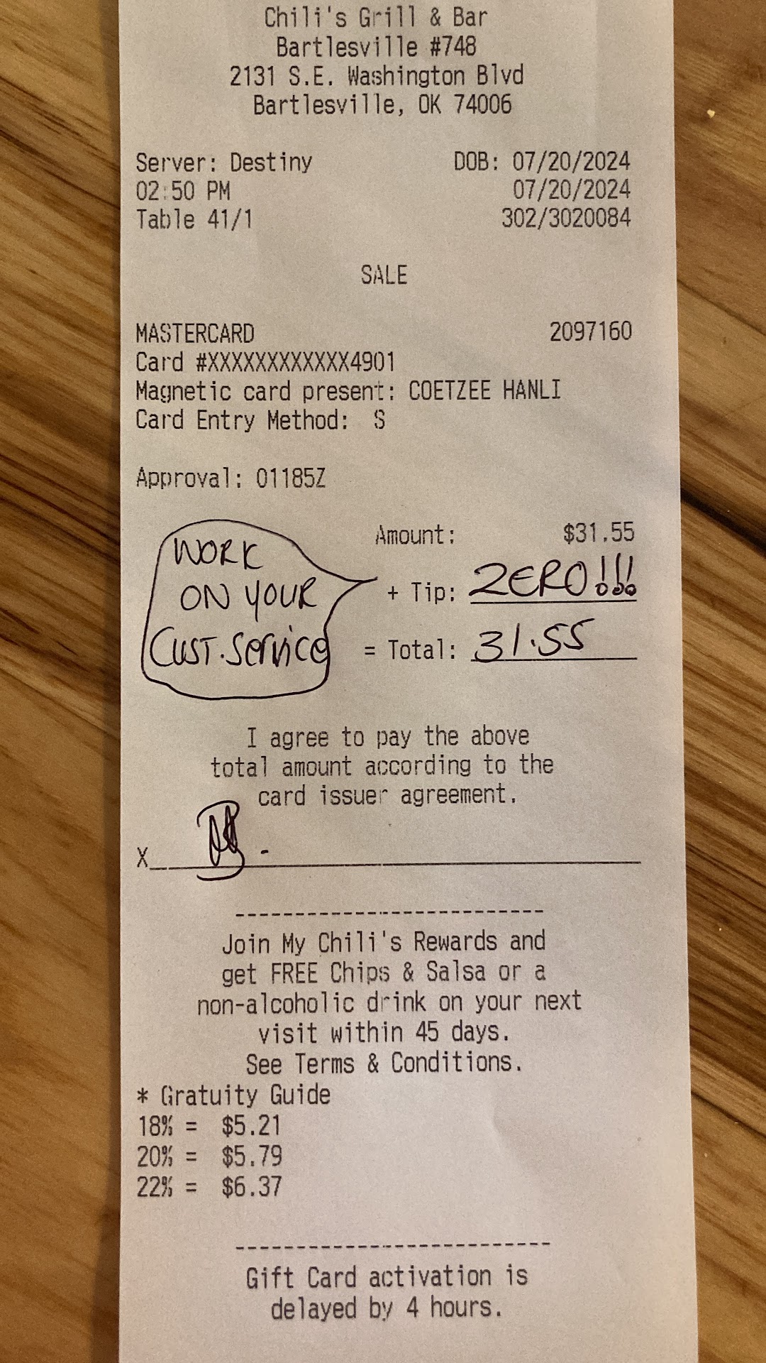We recently visited Chili's in Bartlesville, Oklahoma. We normally make the drive to Owasso, but decided to give the Bartlesville location a chance again. Obviously, this was a mistake. My husband ordered the chicken fajitas for his entrƩe on the 2 for $25 menu. He looked at the waitress and says, "I would like to add on some beef to my chicken fajitas, that's $2 right?" We have ordered this at least 10 times prior (at this Chili's and 2 other locations) and this was always the case. The waitress replies, "Yes, we can do that." She was very nice to us and our children. Our bill comes out and shows an additional $6.29 for meat. We address this with the waitress who then sends the manager because the waitress said she rang it up wrong. This manager was condescending, hateful, rude, and would not listen to what we said. She came out and rudely says, "You ordered extra food, it's an extra $6.29." I'm sure her problem with us was the fact that I am overweight so she felt she could talk down to me, as many people do because of my weight. We explained that my husband specifically said he wanted to add beef to his fajitas for $2, which we have done in the past and the waitress agreed. The manager replies hatefully that its $6.29 to add meat, it's always been that way. If we wanted the $2 option, we should have said "sub-out" so they would substitute some of the chicken for beef. I tried to explain that we don't know their specific vocabulary since we are not employees. I again mentioned that my husband specifically said the price of the option he wanted to the waitress and that if this was incorrect, this should have been said to us. The waitress even stated that she rang it up wrong. The manager didn't care. She wanted to treat us like idiots because her employee made a simple mistake. The fact wasn't that we couldn't pay for the meal. The fact was that something was rang up wrong by the waitress, who stated this multiple times. If this added on extra meat instead of substituting some of the chicken, we didn't know this. But because my husband said the word "add" instead of the word "sub-out" she wasn't going to do anything about it. I don't work for Chili's and never have, so therefore, I don't know their specific vernacular. Our evening was ruined because this lady wanted to spend 15 minutes arguing with a customer to give her some sort of weird satisfaction. We came to Chili's for a nice night out with our sons and by the time this lady was done trying to get her extra $4.29 (that wasn't even owed to her), our dessert had came out and was the ice cream was melted. I know she was discriminating against us because of my weight, and I honestly don't even really care about that. I do however, think it is ridiculous and pathetic to treat your customer's like trash because what we ordered was rang up wrong by...