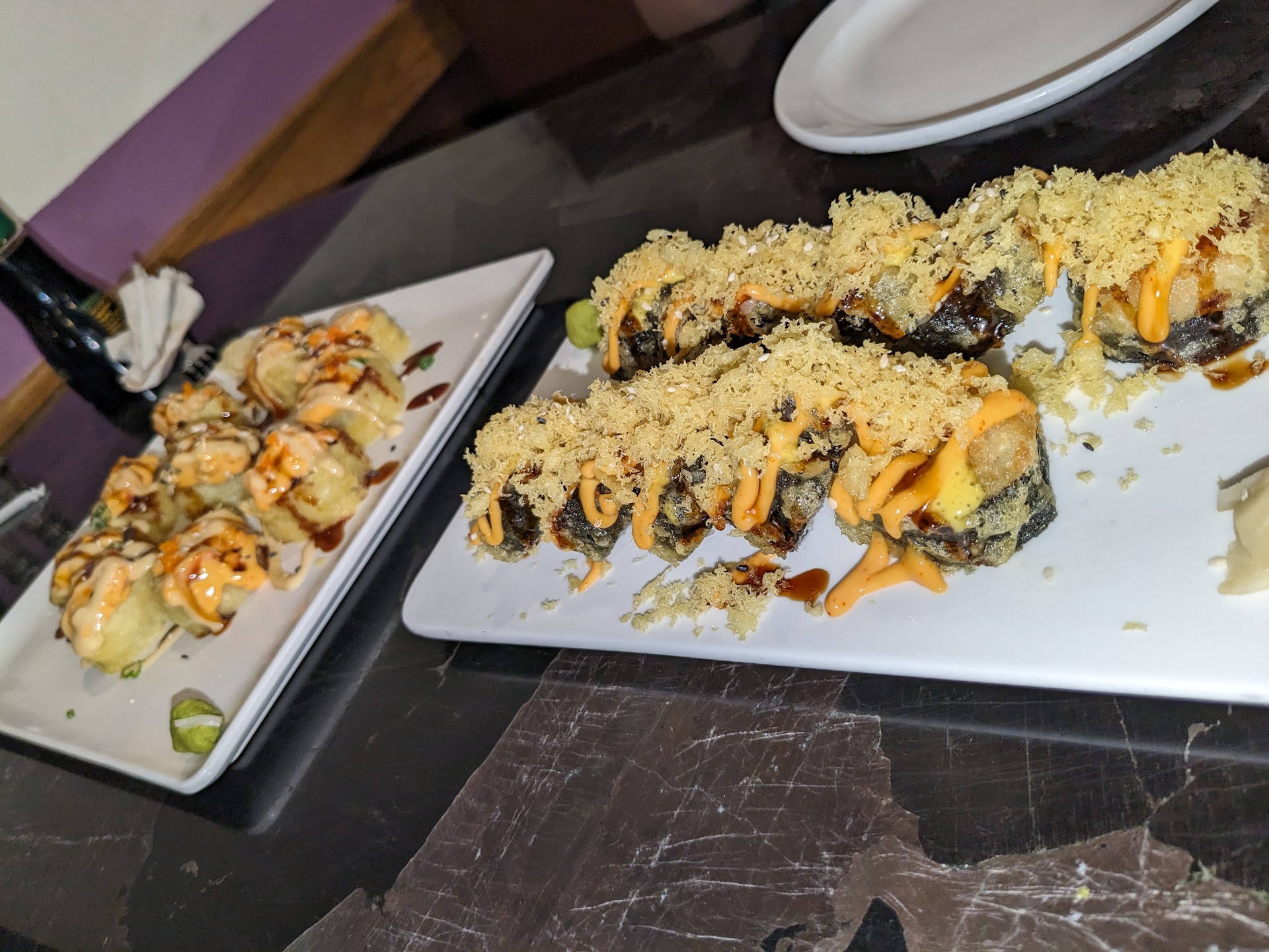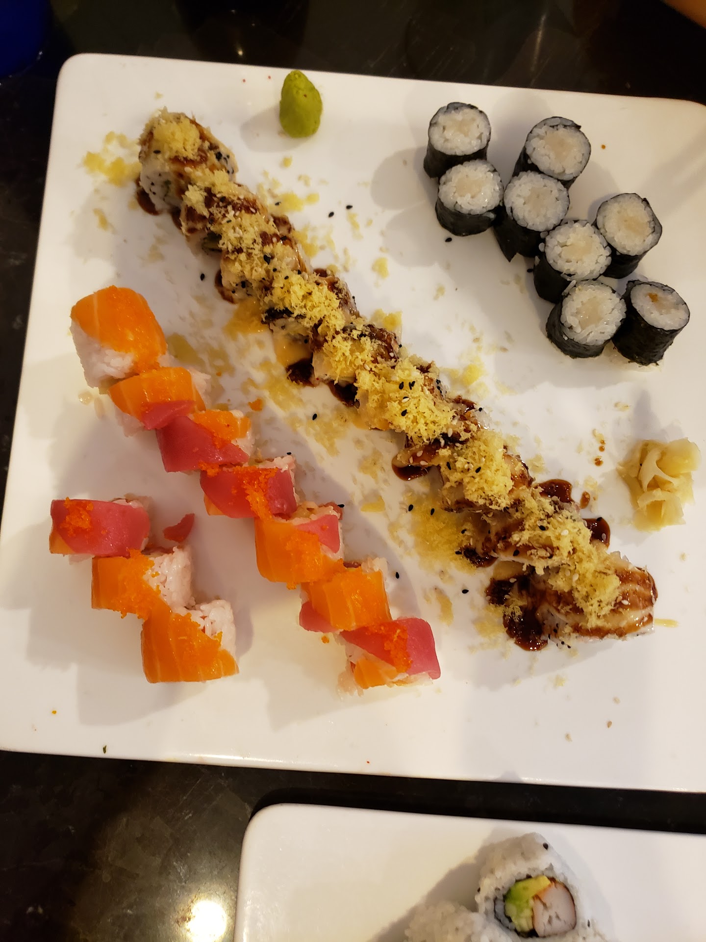 The restaraunt is in a little strip mall, if you didn't know it was there, it's hard to see from the highway. Please do not let the looks of the interior turn you away. Everything was clean and neat, it's just a little dated (probably because the building is owned by some other party). It does not take away from the food. If you are one of those people that has to have the whole "visual experience" to go along with your meal, Sushi One might rip your space/time fabric into two pieces. On one hand, the interior is not very visually appealing, on the other hand the food...the food is so damn good, you had better stay to eat and try not to choke on your visual appeal!