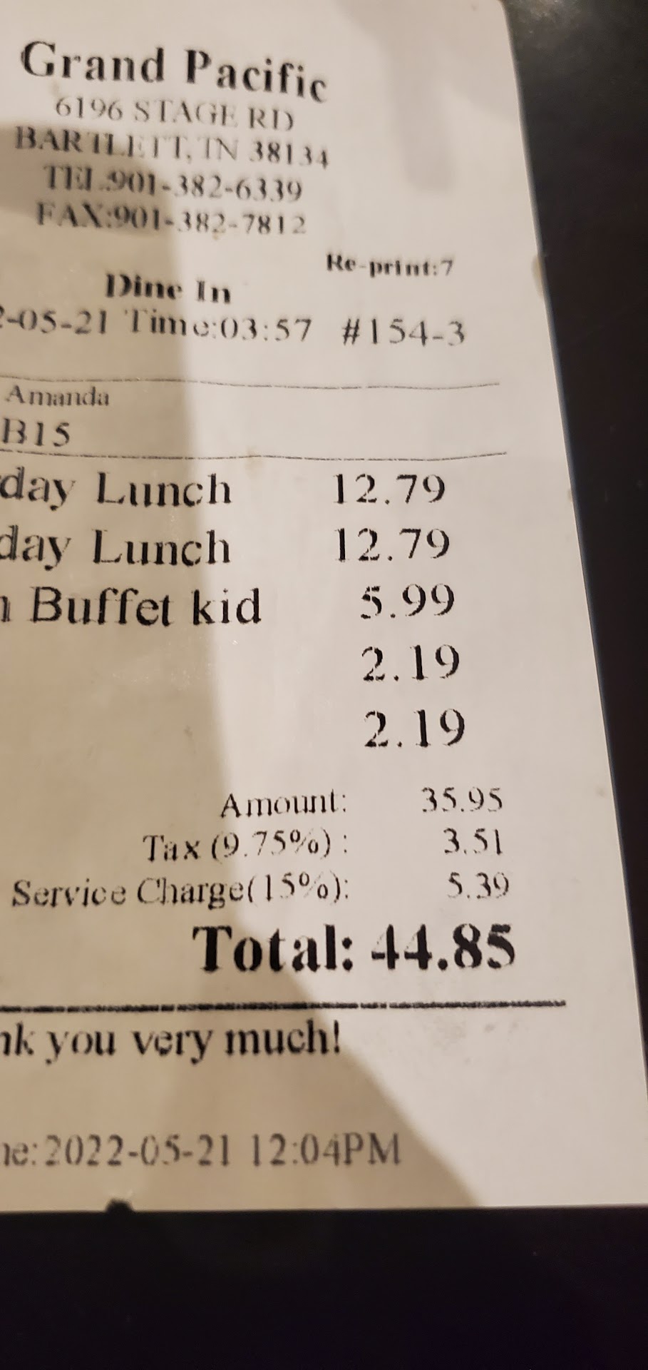 Things went downhill fast. One of the kids wasn’t planning to eat originally, and the staff became obsessed with it. They repeatedly circled back, counting plates and drinks out loud, saying, “Only five people eating.” Later, when that child changed her mind and had only a few bites, not even half a plate, they still charged as if she had eaten an entire meal.