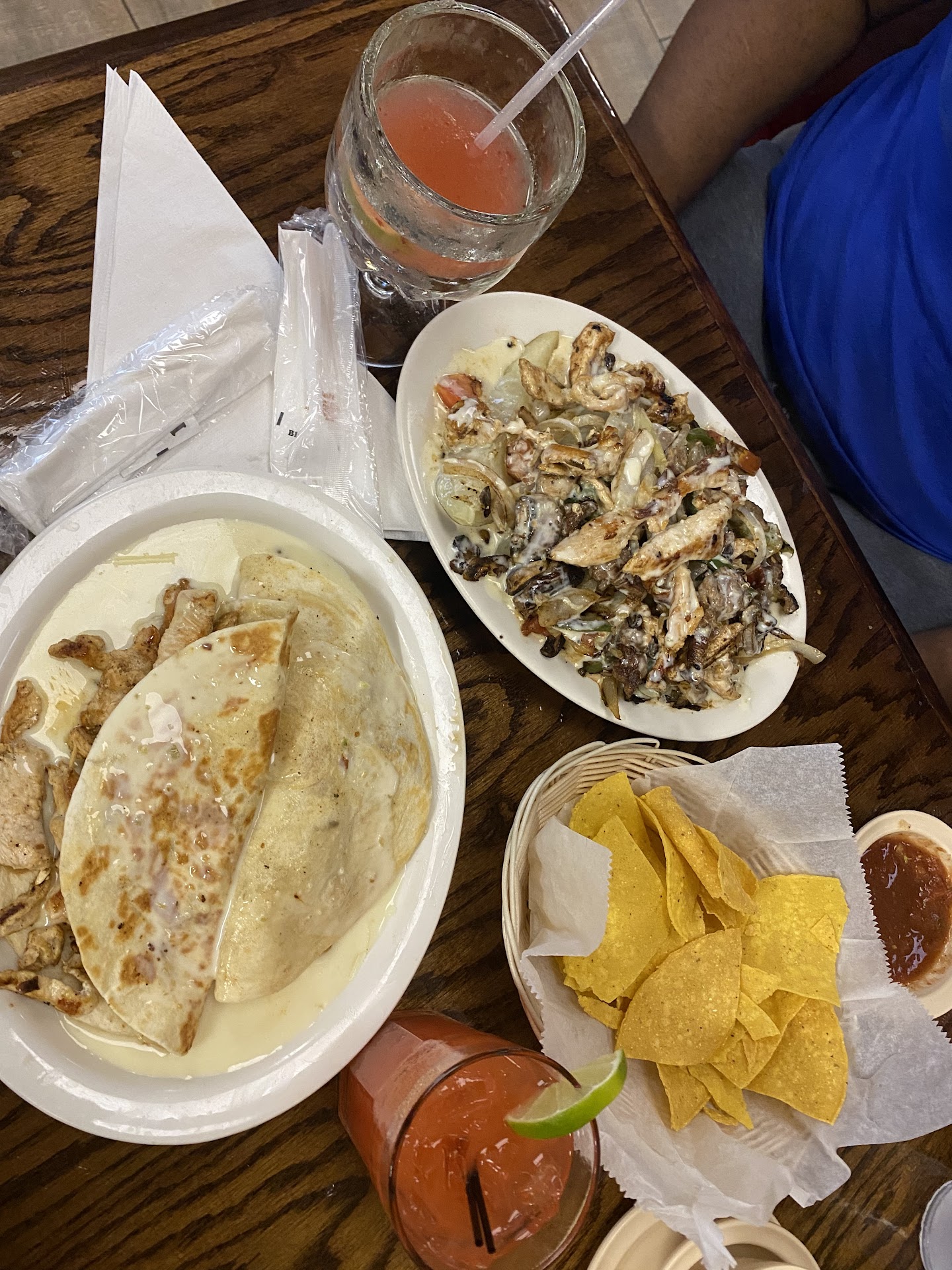 Chips are staled, server seemed to have an attitude, over heard him tell a lady that brought a take out order back, not sure of why. " next time check ur order and don't bring that one back". Ordered fajitas, menu describes tender strips of chicken and steak. I finally spit the steak out after chewing for 5 minutes, the chicken was burned, shrimp are over cooked. I love mushrooms and menu claims they are in the fajitas, never found a one. Idk why I decided to come here, I usually don't. I don't think I'll be back. I'm pretty done and now I get my water. I made myself a little taco salad with the shredded lettuce, beans, sour cream, pico, guacamole and couple of shrimp. Margaritas decent for a restaurant, you have to order top shelf to get a decent one. I'm the only customer in here, so being busy isn't an excuse. And friendly isn't the word I'd use to describe this place. I'm usually a good tipper, I waited tables and tended bar for many years, but wow. Well at least I didn't have to cook, but do I want to eat it... Hope every one else has a better experience and I hope they read this and take into consideration the things I wasn't happy with and do better. Mexican restaurants are on every corner, i can easily go eat at...