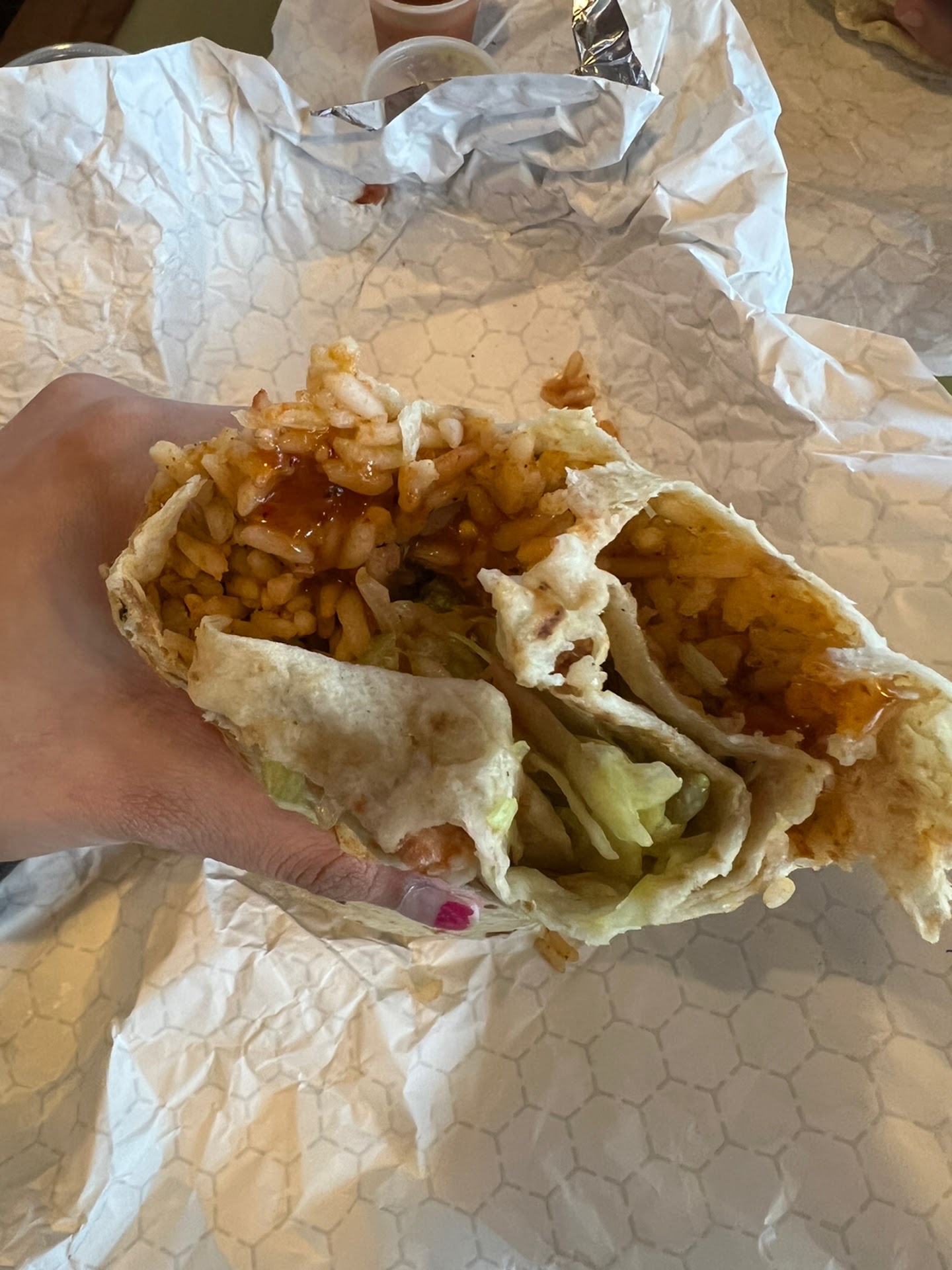 Update: In response to the owners reply, first off I’m incredibly sorry that you had to stare me down after I complained my burrito was not made properly. Yes, I took pictures while eating because I was extremely upset my burrito was not made properly— and to clarify— THAT is the purpose of reviewing. And secondly, I typed my review AFTER leaving, please refer to the time stamp on the receipt that I’m sure you have. Everything in the owners reply is a lie. I sat down with my fiancé to eat my burrito. After 5 bites, my burrito was STILL very dry which was unusual to me. So as any customer would do, when an employee walked by, my fiancé mentioned to him that the ingredients that I asked for in my burrito were not visible, in fact they seemed like they were missing completely. He went over to his owner (with my burrito), which I’m sure is the guy that responded to me- and the owner walked back with my eaten burrito in the same foil and plopped it back right in front of me claiming “the ingredients are in the middle”. I was not rude, I did not argue, nor did I complain after throwing everything away. As he told me to do, I ate my way to the middle of the burrito and still there were no ingredients. I knew there was no point in complaining anymore as the “owner” who brought my burrito back was pretty firm on “I’m right and you’re wrong”. Since you were so busy staring, I’m sure you noticed how upset I was after the incidence. Anyone looking at the picture should know my burrito was to have lettuce, rice, beans, sour cream, cilantro, fresh jalapeño, guacamole, and pico de gallo. All I see is way too much rice (the weight) and the salsa I added to help with the poor taste. Oh and yes— the picture posted is from the MIDDLE of the burrito. After that picture I spilled the contents of my burrito just to double check if the ingredients could possibly be on the other end, but unfortunately I was wrong. I really like how you replied I was sick from overeating because I for one, threw away practically everything we ordered.