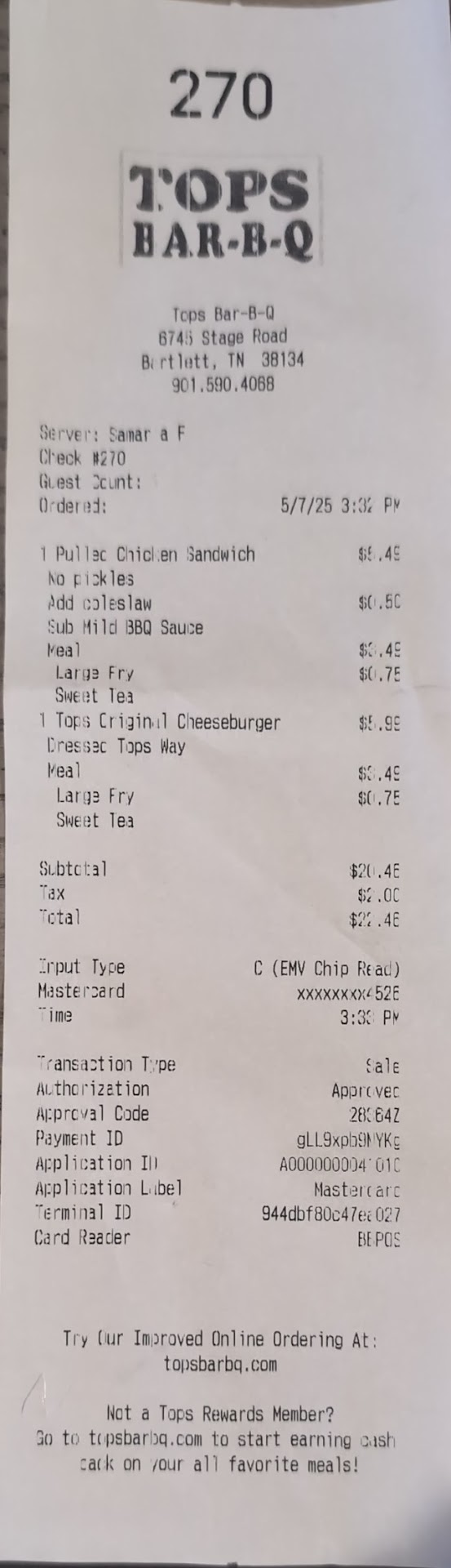 Read moreMy husband and I are traveling and are try restaurants we have never tried before. So with the suggestion of a lady we met she suggested TOPS. I placed the order online, paid for the order and was given a 3 digit number and to allow 15 minutes. I did so. We went through drive through that was very slow and long. So we get to the window and tell the young man we had a pick up.he ask name. I wasn’t ask for my name. I gave home $$. He said it wasn’t paid for. I assured him it was. He closed the window and brought back another worker. We went through the process and she stated they didn’t have pick up orders. I told her placed order on line. OH you have to come inside for that. Needless to say I’m confused and aggravated. I pull around and go inside. She ask if I’m Door Dash!! I t old her no. She went over order. She assured me it was correct. Upon arriving home……….you guessed it. No slaw on my sandwich, I ordered a large TOPS with all the fixings’ and received a plan pulled pork sandwich, but was charged the extra 1.20. Frank and Sassy split a whole rack of Sweet BBQ ribs that were cold, dry and tough, no sauce for extra as requested. I asked for 1/2 and 1/2 ice tea and Franks usual Coke. We received a cherry coke and a sweet tea. So $43.60 later. We are all disgusted, Sassy ate Turkey, I ate butter and crackers and Frank at Turkey Sanwich, Take you Millington for the worst experience possible. I waited two days and I still have a bad taste...