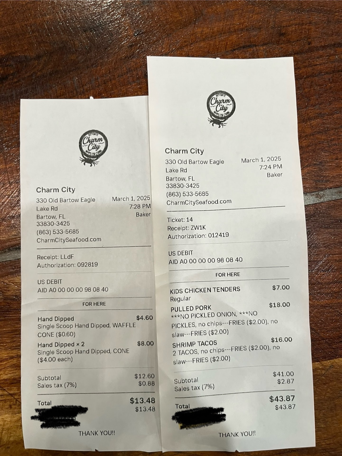 I was charged $8 for fries substituted on my meal! In addition the kids meal chicken “tenders” were like nuggets and were over fried. The pork sandwich was overly sauced but I did enjoy the shrimp tacos.