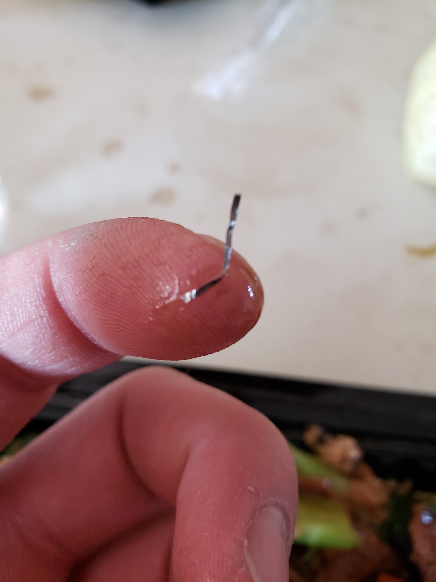 Read moreFood was just meh, as the beef in my beef and broccoli was just too chewy. I was swirling my fork around as I was chewing and found this in my food. A piece of what looks to be like stainless steel scrubbing pad. Ah and no utensils and napkins were supplied but luckily I had stopped by Casey's right before. The paper bag the food was in broke because the lid from the b&b came loose and the sauce just tore everything below it apart. The trays fit very tightly inside the bag so that must have been the reason. I was debating this place or noodle bar at the legends. Guess I chose wrong. Very...