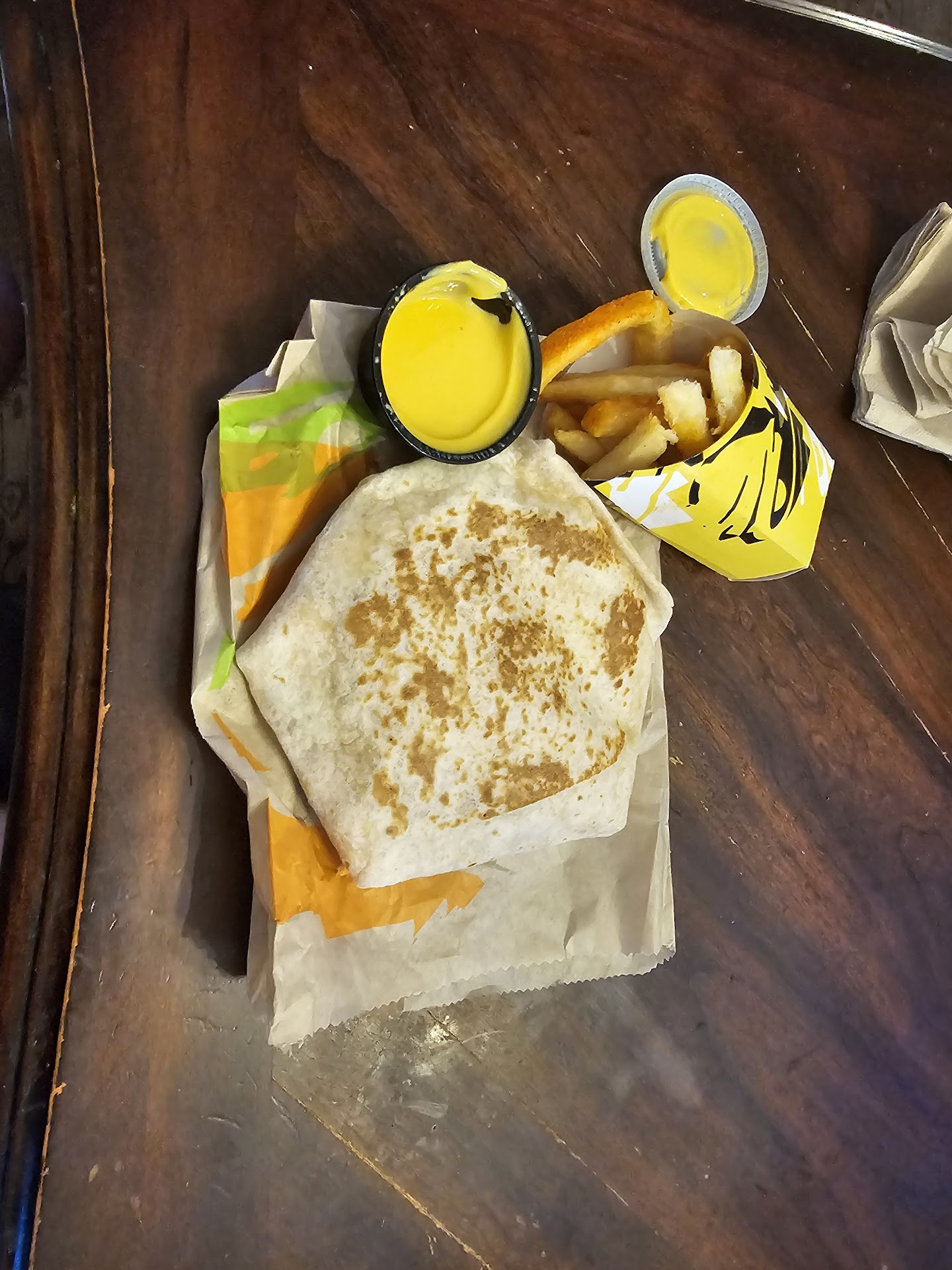 Read moreStopped and walked into restaurant. No one came to counter to take my order until I knocked on the counter. Asked, where is the menu and was told we don’t have a menu other than on the kiosk. She ask me to order on the kiosk and I said I prefer not too. She told me I could get the menu by scanning QR code and I said I prefer not to give Taco Bell access to my phone. She took order and she gave me a total and I pulled out my cash and she got a funny look on her face. She told me she didn’t know if there was a cash drawer at the counter station. She gave me change from my $20 but said there was barely enough cash in the drawer to make $5 in change. In addition someone had been sweeping the floor. 3 piles of dirt was on the floor in the lobby and the broom was leaning against the window. I’m sorry but that is the clearest indication in the world of poor and lazy management. They really need to get their act together...
