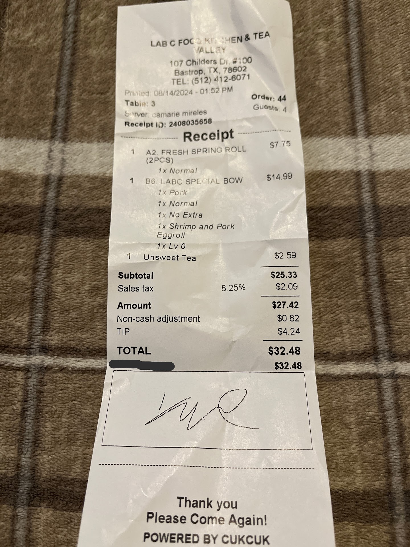 EDIT 08/14/2024 Gilbert, I decided to give LAB C another chance and I came in for lunch today at approximately 1:00PM. The restaurant was half-empty and there was one cashier and one server working. I ordered (1) A2 Fresh Spring Roll - 2-pieces and (1) B6 Lab C Special Bowl Pork and Shrimp and Pork egg-roll - and an Iced Tea. My bill came out to $32.48!