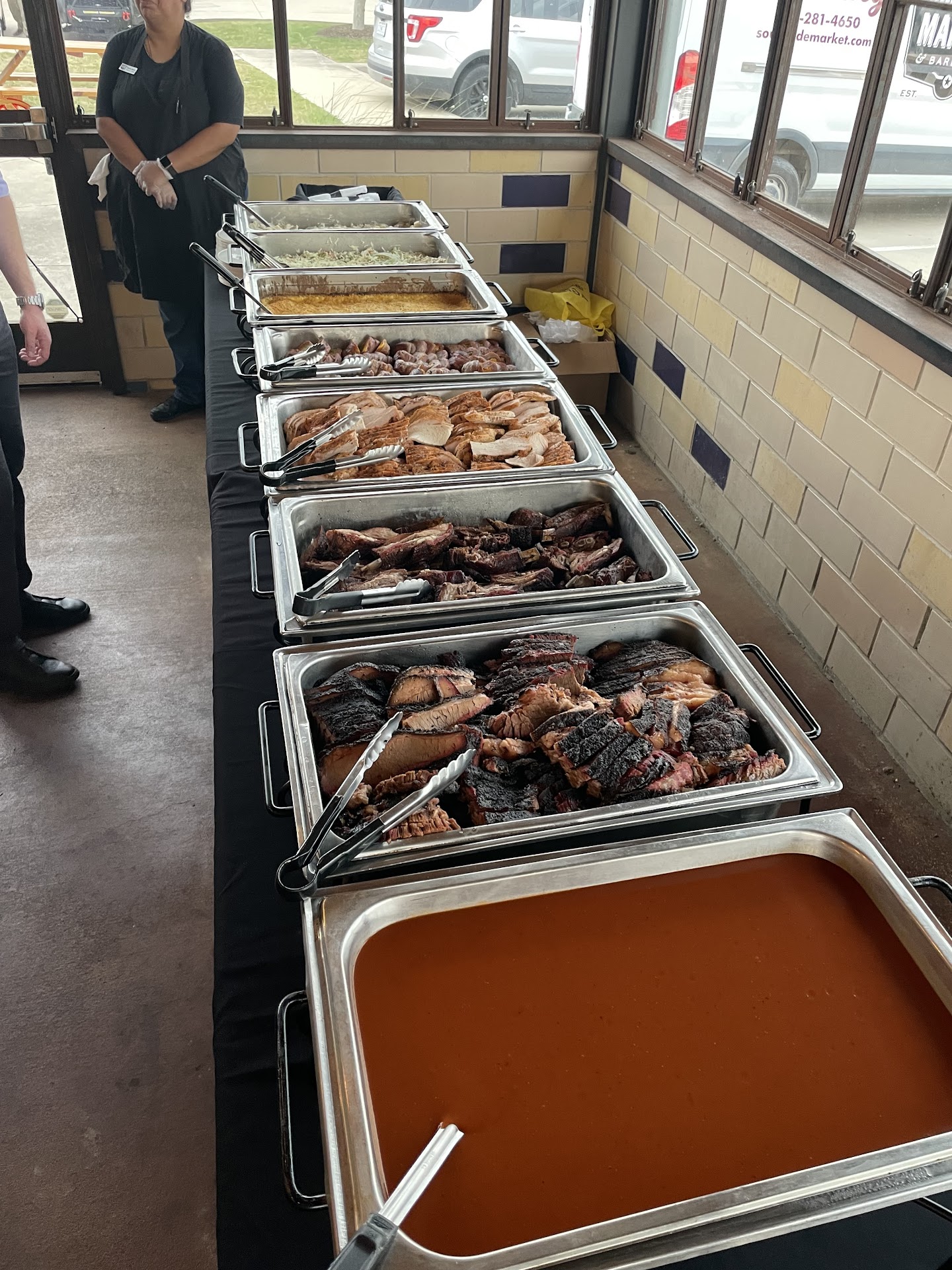 Read moreMy husband and I considered using Southside BBQ for our wedding caterer, but ended up using them for our rehearsal dinner instead (not because the food wasn't amazing, just because lots of weddings in TX serve BBQ). We were so happy with this decision. Our rehearsal dinner was 70 ish people, but Southside was able to accommodate us in the covered patio with no problem. We were completely separate from the rest of the dining room and had dedicated staff members. We knew how incredible the food was from our tasting almost a year ago, but our guests were just amazed. It was awesome to introduce our families (from New Jersey, Iowa, and Missouri) to some real Texas bbq. We served brisket, smoked turkey, lamb ribs, bacon wrapped sausage, mac n cheese, coleslaw and potato salad. The lamb ribs were my favorite thing. We didn't have the best experience with our first catering gal (very nice, just not terribly responsive) but once my husband asked to work with someone else, we had great service. Robert Wells the head of catering) was delightful to work with and even brought in specific beer and wine for us, outside of what the restaurant usually serves. Lynda, the GM of this location, was also fantastic and helpful. Robert brought me an apron to wear to protect my white jumpsuit, brought in tea and water pitchers that I forgot to order, and took some group photos for us. Amazing food, service and experience. We will definitely be having a meal here whenever we pass through...