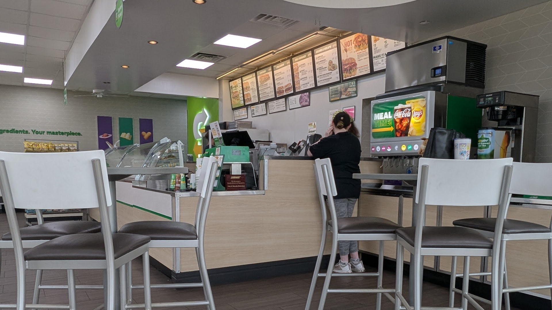 Original review: Like subway: appreciate that you can ask the preparer/employee to customize your sub in front of you, for example, you can have some onion & green pepper toasted with your meat & cheese; this gives these veg a light cooking that my stomach approves of... This subway has usually pleasant, cooperative people working behind the counter; these workers have changed regularly over the years, but poor attitude workers don't last long. Nice bright seating area full of windows that is kept clean.