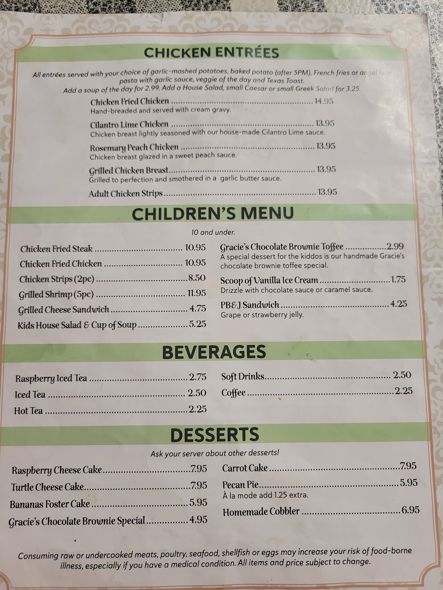 Read moreLet’s start with the positive comments… to begin, Gracie’s is in a quaint little cottage on the edge of historic downtown Bastrop, with a waitstaff that were very friendly and welcoming. The food quality was an entirely different story on this visit, the one and only time I have been here. To set the stage, the iced tea was very cloudy and not fresh. It had a very bad taste and was undrinkable, I should have seen this a bit of a red-flag. But I was looking forward to a tasty home-style meal. I specifically ordered my entrée, chicken fried chicken, with the gravy on the side. However, when it was served, both the mashed potatoes and the chicken were smothered in an excess of cream gravy. It was like a good quarter inch thick on the chicken, easy enough to scrape off, but it did put a damper on the experience from the get go. The waitress stated the chef realized he did not meet the order but had her send it out to the table anyway without fixing it- this speaks volumes to their concern for quality which is essentially nonexistent based on the chef’s comment. As a rule, I do not send food back, you never know when you will offend a passive aggressive chef and end up with an illness :-). Just a smart play in my book. Moving on to the side dishes, the garlic mashed potatoes were cold, lumpy and flavorless with not even a hint of garlic present. The green beans, which were the only vegetable available at time of visit - were also cold and flavorless, in fact they were mushy and had tell-tale sign of over cooked frozen green beans that had been sitting for some time. Overall, I have to say I was very disappointed and can not recommend that people even bother trying this place - skip and go to the next option on your list. I probably will...