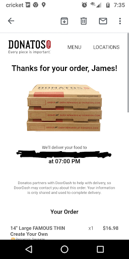 Read moreI finished placing my order at 7:01pm. Was told it'd be here 7:36pm. I have been sitting at my front window since 7:25pm to make sure I didn't miss the delivery. It is now 8:08pm as I am typing this sentence and still no delivery. This location has a really bad history of being lazy and not having orders ready at the time promised. I used to order from this location every 1 or 2 weeks for years up until about 5 years ago because of their service. Now they're lucky if I order 3x a year. I have personally stood in the restaurant watching employees mess around and argue and not even make food when my order was supposed to be ready then and they had numerous tickets hanging. Making me wait over 1.5hrs for carryout at one point. I managed a local pizza chain for 10 years. This is unacceptable. Whoever is managing this location needs retrained or a serious change in leadership needs considered. It is now 8:13pm and still no order. I am less than 3 mins away, less than 1 mile as the crow flies. And over $5 for a delivery fee is theft. When I managed general rule of thumb was the price of 1 gallon of gas was acceptable delivery fee. You are the #1 highest fee in the entire area, by far, not even close. Most places are around $3. That's also why, while I know it's not their fault or policy and having worked in the industry for years, I don't tip your drivers nearly as well as other companies. Paying $5 for delivery less than 1 mile away, on a simple order mind you, large pep and 6 breadsticks, and being told 35 mins and now at 1hr20mins, over double the promised time. It is now 8:20pm.