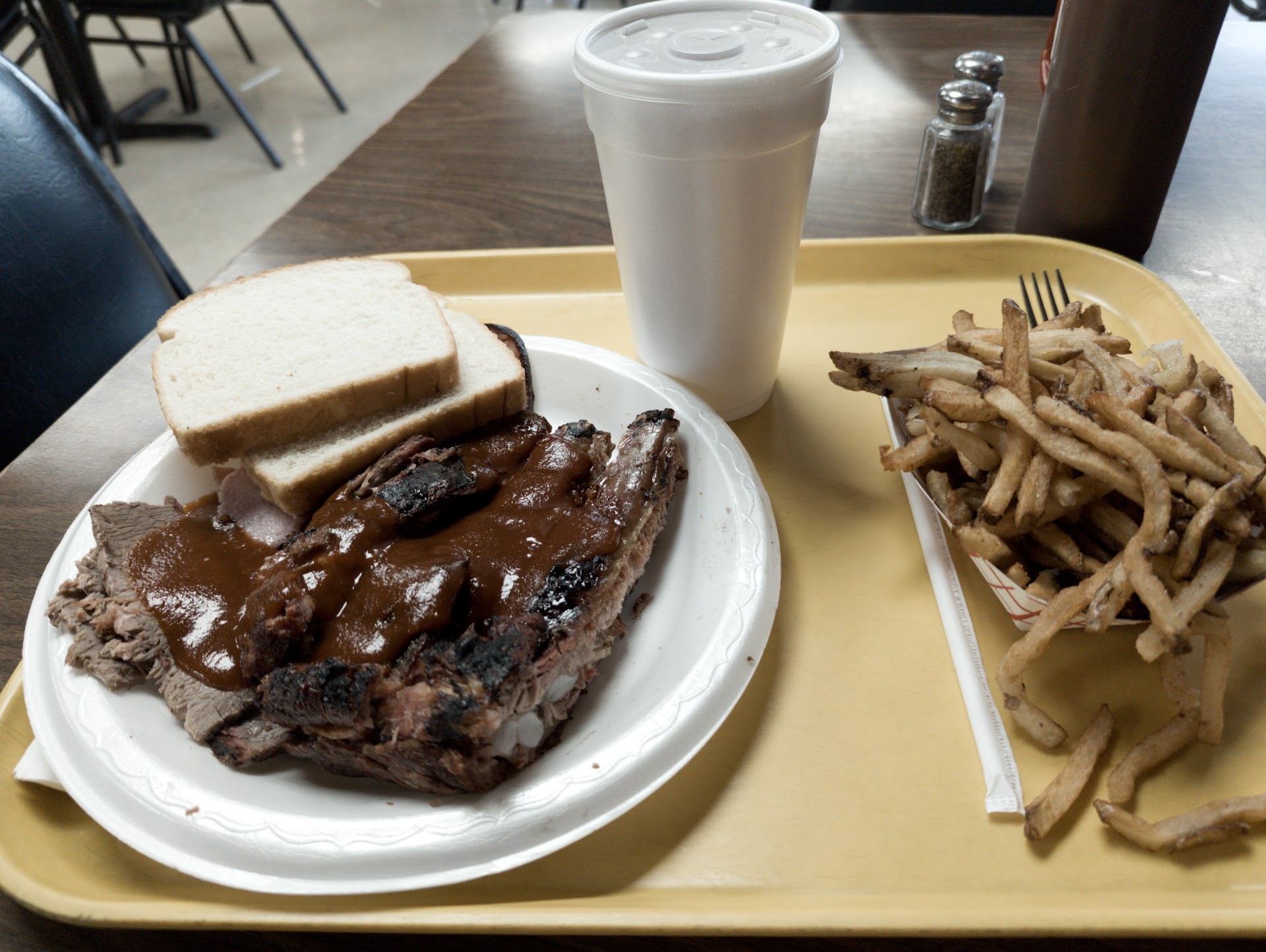 Read morePeople were very nice. The set up is old style BBQ, you just grab a tray and tell them what you want. Bathrooms were clean and look nice, but they are very cramped. Some of the food was good. My fiancée got a pulled pork sandwich. It was a little dry. I got the meat sampler. The beef and pork were okay. The ribs were very good. I would recommend them. The BBQ itself was tangy so if you like sweet BBQ I would not recommend. For the sides we had baked beans, coleslaw, and French fries. My favorite were the French fries. They were fresh. They are more like the cut of a five guys fry except not as long and a little greasier. They were really good. The beans were okay. I really appreciate that they seem to have gone for a unique taste instead of just doing a generic sweet BBQ beans, but it just wasn’t a taste I enjoyed. The coleslaw is vinegar based and not sweet. If you enjoy Mayo based sweeter coleslaws I would not recommend. We also had a snicker doodle cookie. It was very good. Not quite to the homemade level, but close. And they are super big! Not a place we would probably go again, but that’s more about our tastes then their performance. If you’re a fan of tangy BBQ and fries then it’s a...