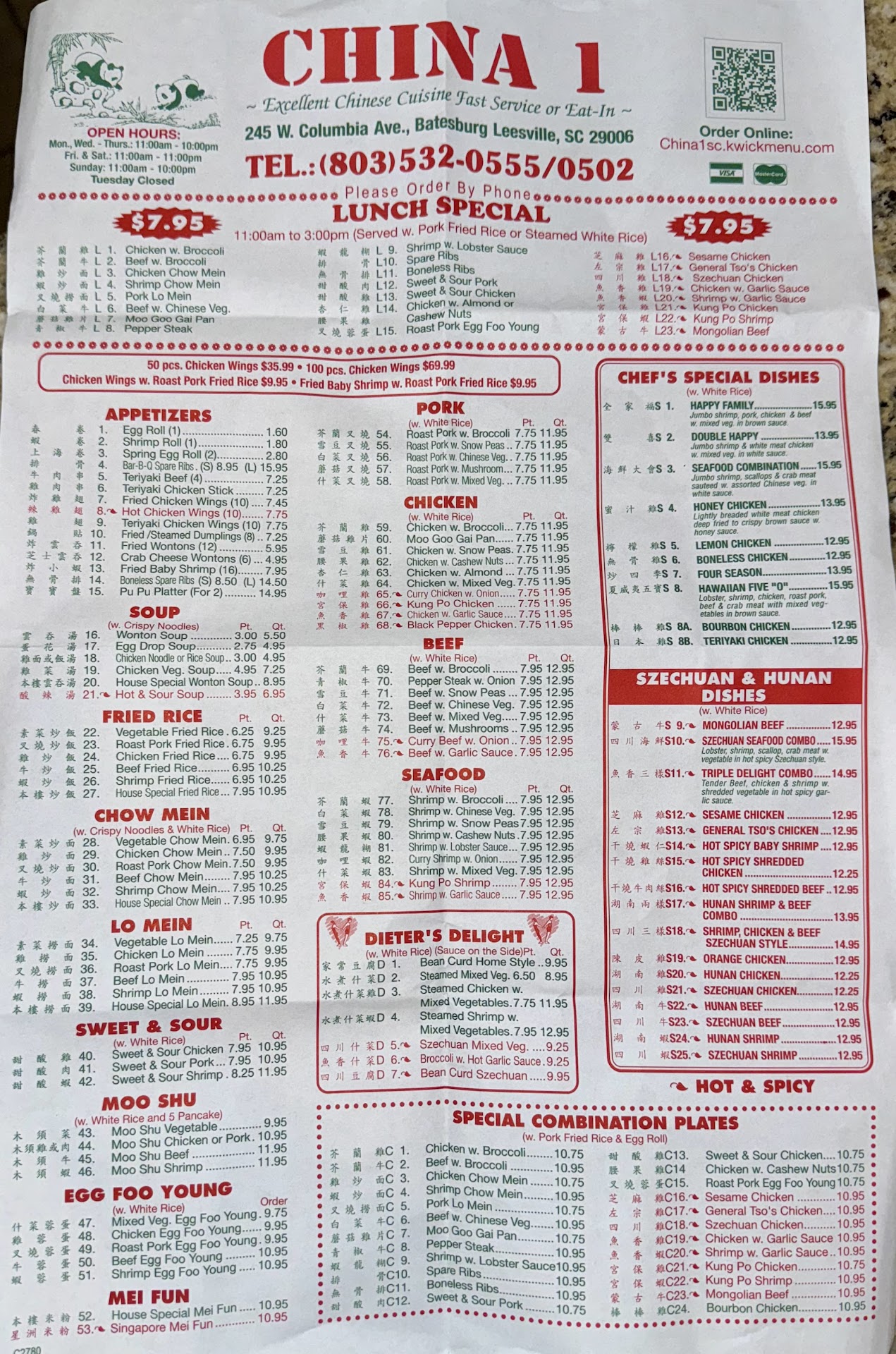 As far as ambiance or atmosphere, the place is a Chinese restaurant, the majority of whose business is take-out. That said, it was clean, it was busy and had tables to sit at in the event you canāt wait to get home to eat the best Chinese food in SC. Sit down, chill out, enjoy your food and chances are youāre gonna see your neighbors come and pick-up and you might even meet a friend who you havenāt met yet. Iāve included a menu shot and some food pics!!!