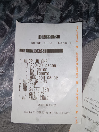 Read moreWell , in fact I did go by an purchase a #1a whopper meal at 3:25 p m . after shopping . An after I paid for my meal I pulled up to pay for my meal. After I pulled up I haved to wait to pay because of cars an trucks in front of me . As I sat waiting I turned my head toward the pay window I saw a young man taking money a woman employee walk up and must have said something the young man didn't like because the flip her off. An I wasn't the only person waiting to pay who seen this. But , this isn't the only time I have see bad behavior here from screaming an howling at each others. And a associate helping a person on a computer that wasn't working correctly. An than crucial at them after ward. An they could see me sating at the window waiting for my recipe. Someone needs to speak to their employees about the way they conduct an action on the job. No one likes to see...
