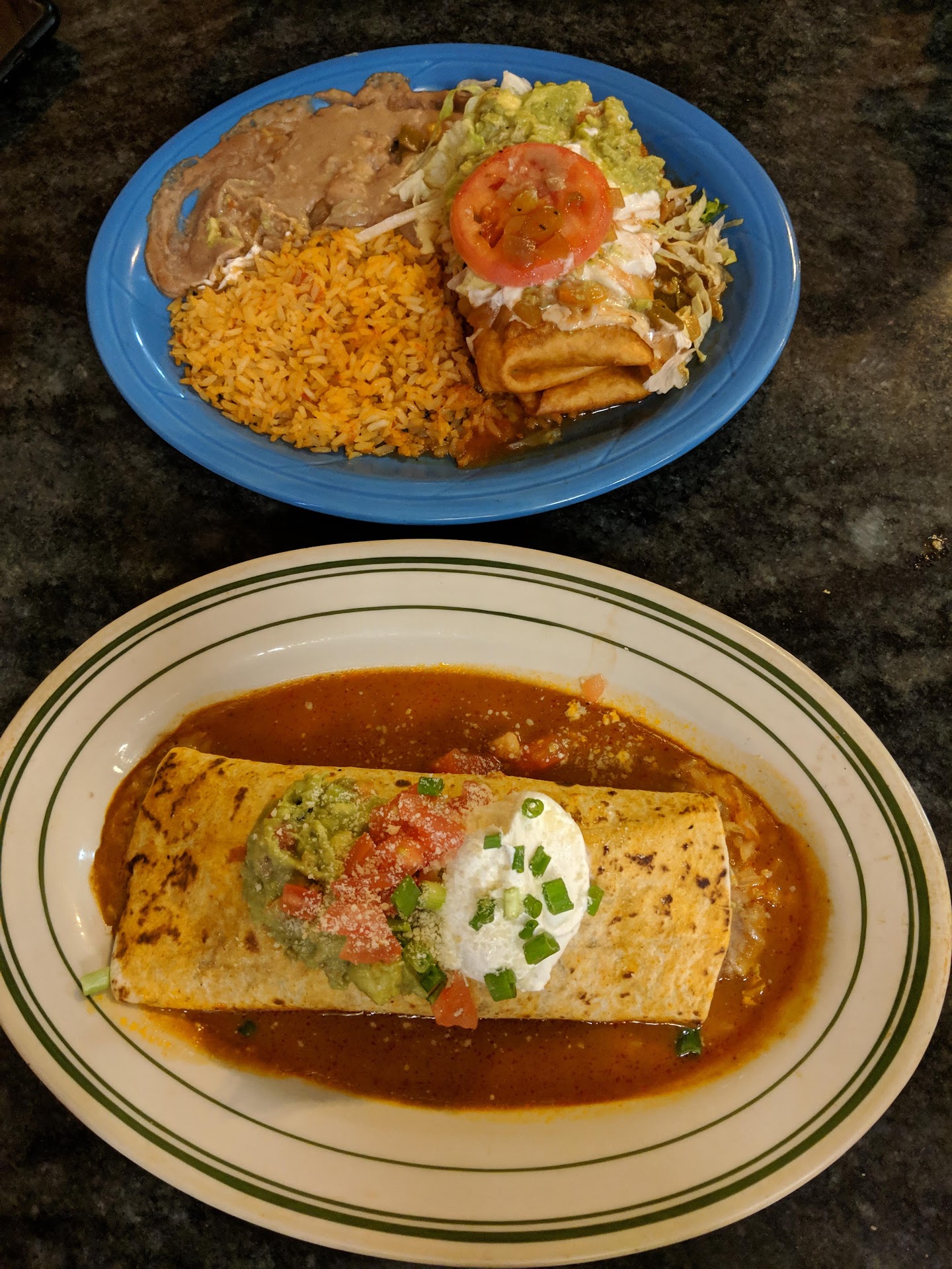 Then our entrees arrived - a small portion of chicken, beef, onions, and peppers for me with a large plate of condiments and three tortillas, and two enormous chimichangas soaking in more of the tomato juice salsa for my girlfriend. My fajitas were passable (although I barely managed to stretch the meat to three tortillas), but my girlfriend only managed two bites of her entree. I tried a bite for myself - the meat filling tasted like the leftovers from a Hamburger Helper mistake and had the texture of cornmeal, while the salsa polluted what little flavor and passable texture was left. My girlfriend and I were both disgusted at this point, and quickly paid the bill and left.