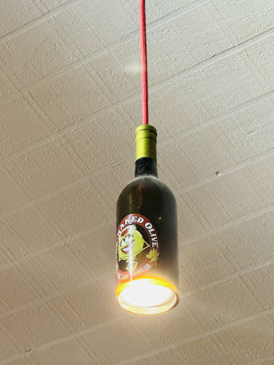 The restaurant has a very cool vibe. Artwork decorating the walls is for sale. Light fixtures are wine bottles.