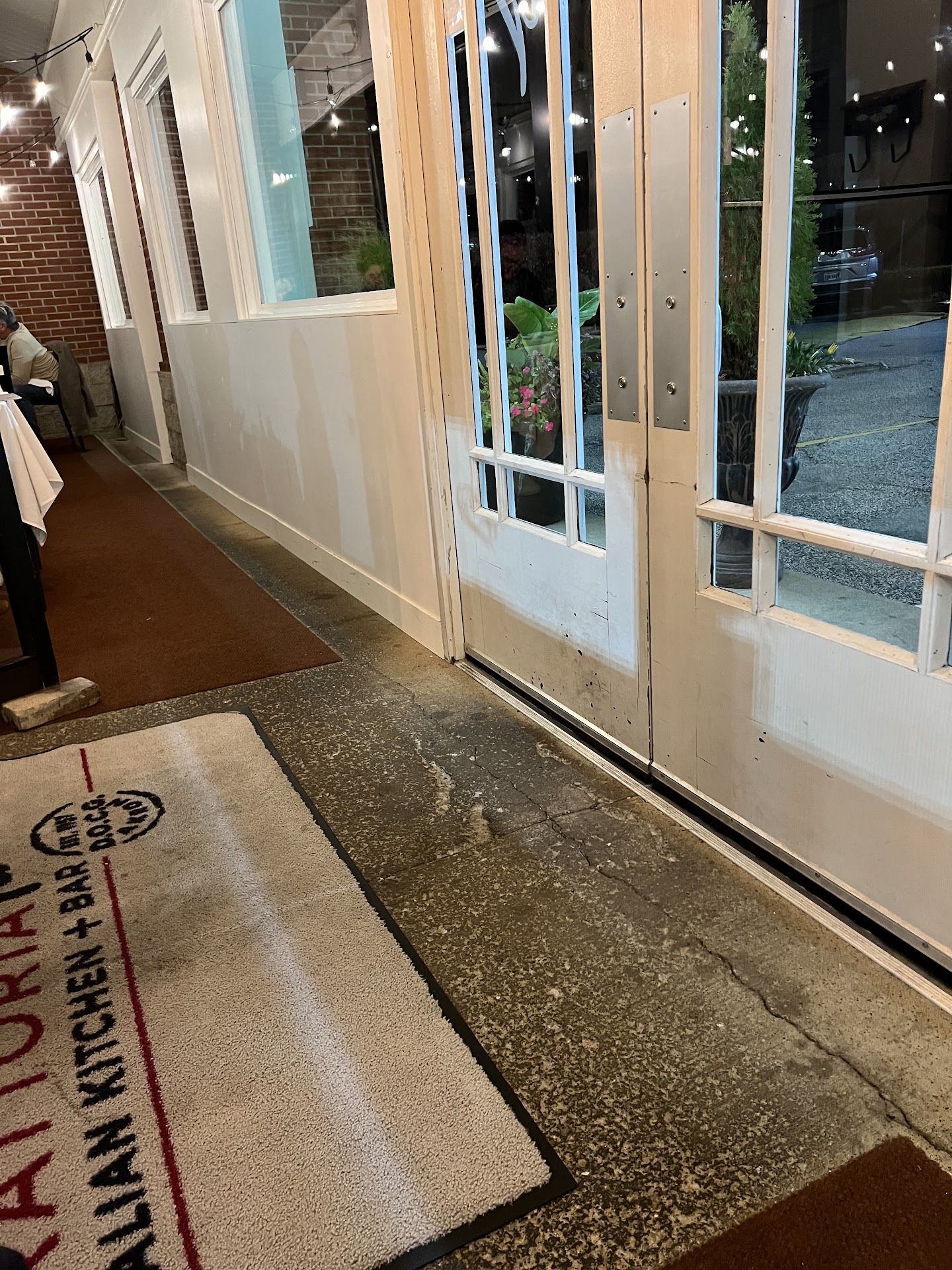 We arrived at the restaurant 5 minutes before our reservation. We stepped inside and the hostess then turned us around and took us back out to the front entrance/hallway. It was lit up brighter than a superstore with stark white walls, dirty cracked concrete floor, dirty red and black door mats and windows into the parking lot (no curtains) so each time a car pulled in the headlights were annoying. Meantime the parking lot lights constantly glared through the windows. Bulbs hung from cords and the heaters overhead would turn on from time to time with a whine, as it was cold due to the constant opening and closing of the door, which was about 4 feet from our table.