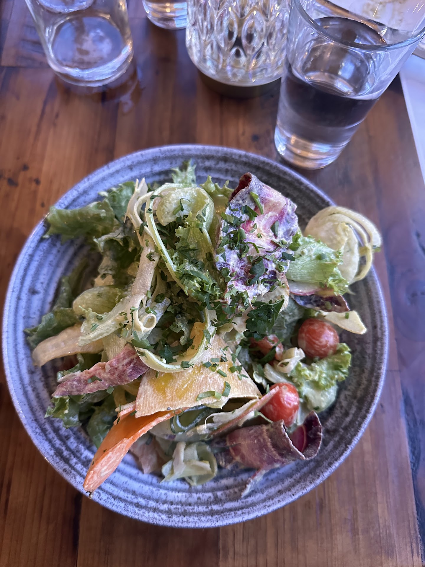We ordered the steak frites on both of our visits, with the second being less enjoyable. Both the demi glaze and the steak itself had a distinct burnt flavor. The fried items on our second visit also felt different than they had on our first, with both the french fries and a fried mushroom being darker and having a stronger oil flavor than expected. The mushroom risotto was listed as containing Wild Fruiting’s local mushrooms, but only the fried branch of oyster mushrooms seemed to fit this description. The bulk of the mushrooms on our plate were large, whole criminis, and it was unclear if these were from Wild Fruiting’s selection.