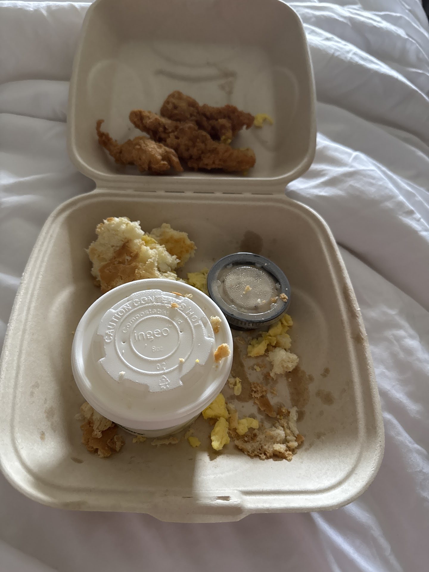 First off, the biscuits were stale to the point of being inedible. I had high hopes, but they were dry and crumbly, lacking any freshness. Then, the chicken tenders I ordered were bizarrely unrecognizable. They appeared more like small chicken legs than the crispy tenders I expected. As for the beignets I thought I was ordering, what I received instead were simply fried dough balls, lacking the fluffy texture and powdered sugar coating that makes beignets so delightful, and unique.