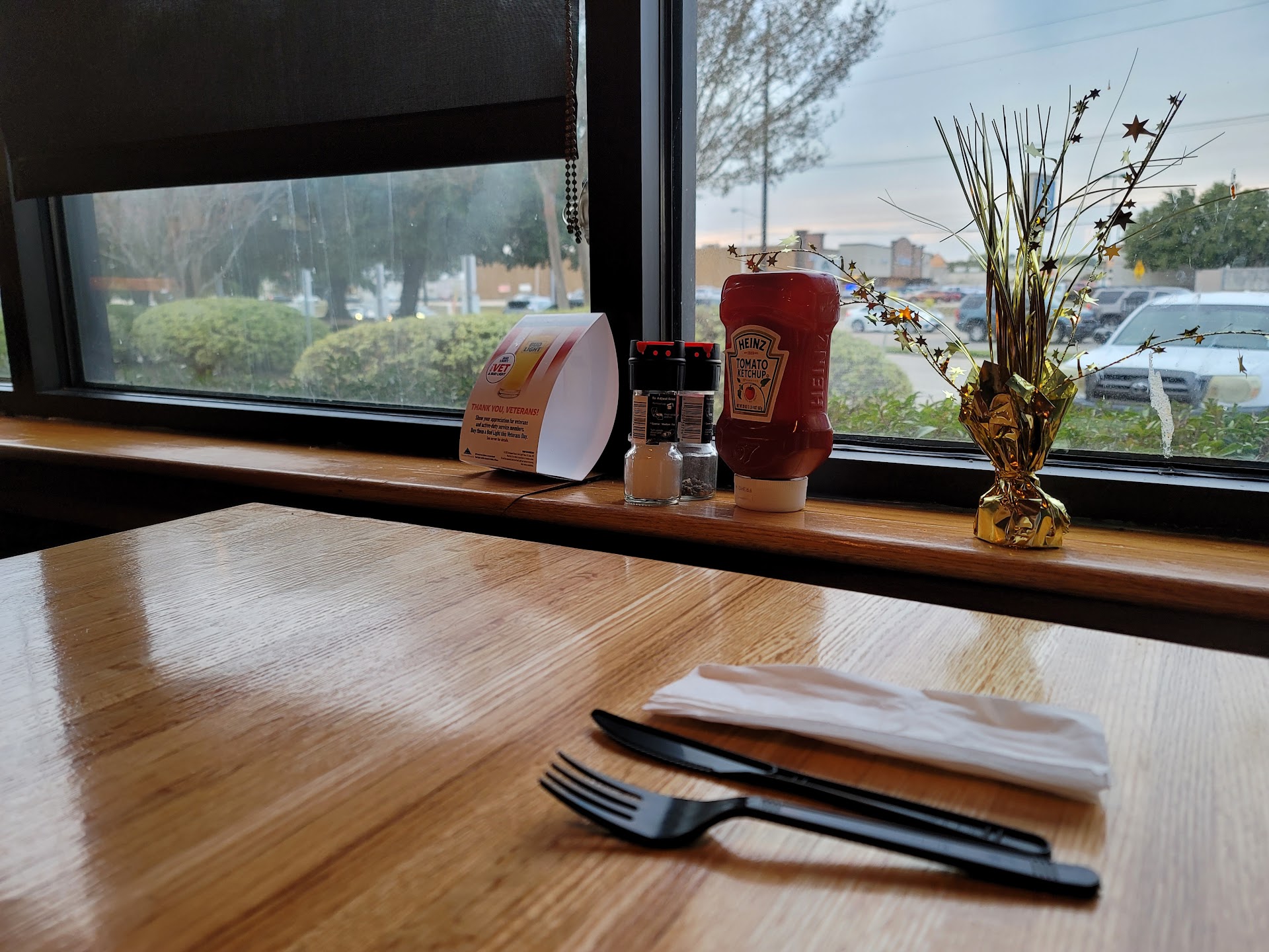 It's okay. I tend to get a burger and a soda to judge a restaurant. The entrance and dining area was clean. We were promptly seated. Found it pretty cold because we were right under the air vents. But that's ok, could always ask to be reseated. The host righted the table for us to sit at. Was probably being cleaned, which is admirable. Got given a pack of silverware and napkin. Not the cloth kind. Made me feel a bit like a child. Were quickly waited on. I ordered a pepsi. It was too much soda water and not enough pepsi juice. It wasn't bad but not strong enough for my liking. Cause pepsi already tastes like a weaker coke.