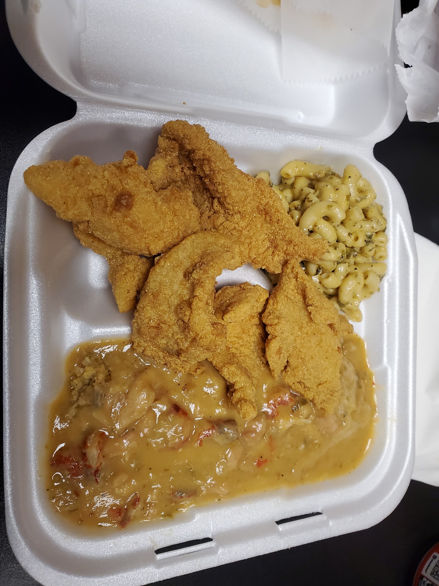 I got the Crawfish Etouffe Supreme, which was the Etouffe served over cornbread dressing with fried catfish. I got mac & cheese and French fries on the side. It was an enormous amount of food, and asily could have fed two people, but I ate it all myself anyway.