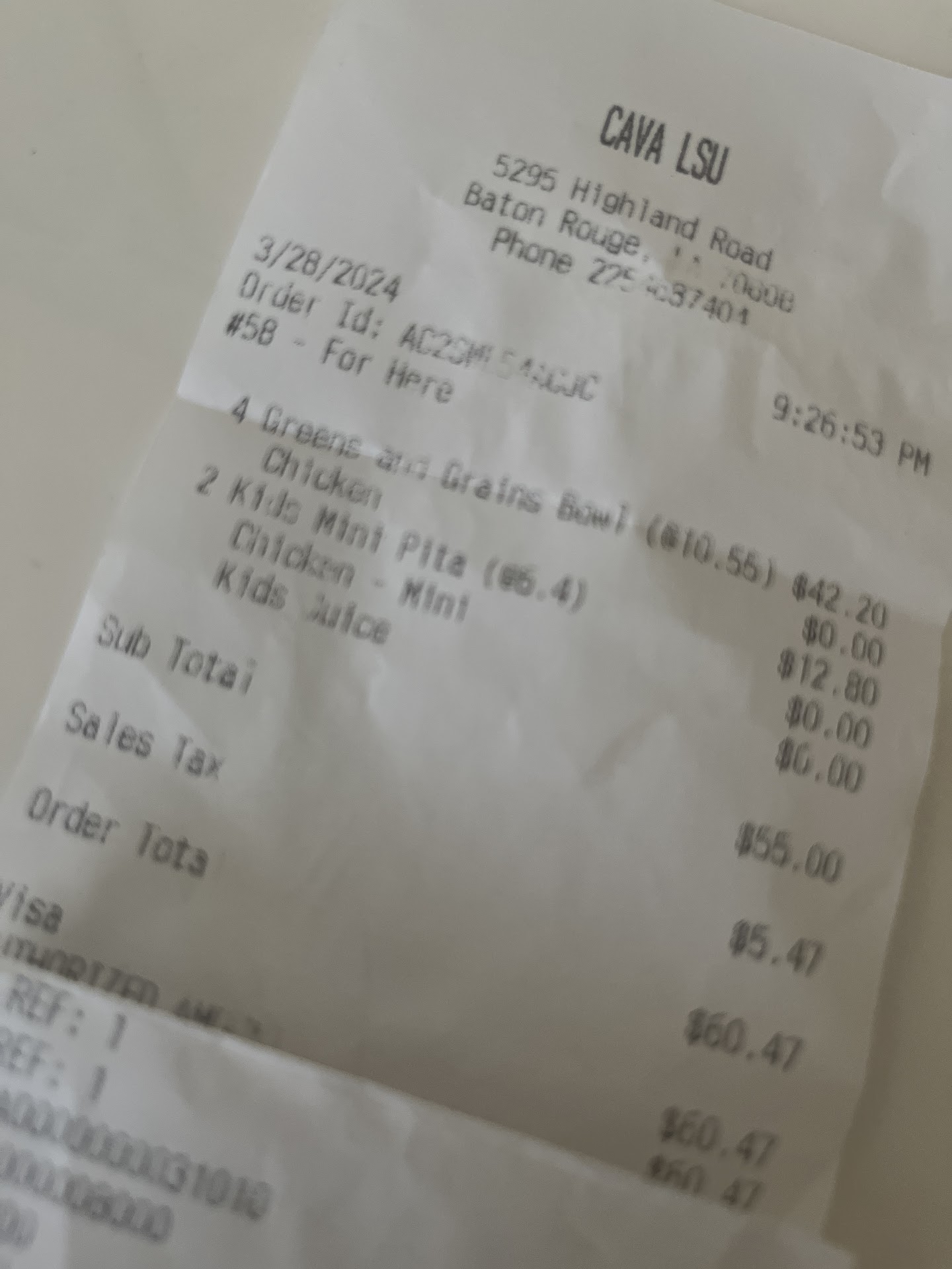 The most horrendous Cava experience Iāve ever had! Brought out of town guest whoāve never been. I rave about Cava, because the food is usually great! We had a terrible experience waiting for missing ingredients at the one in Perkins Rowe 45 minutes prior, where we gave up and headed to LSU location instead, only for it to be WORSE!