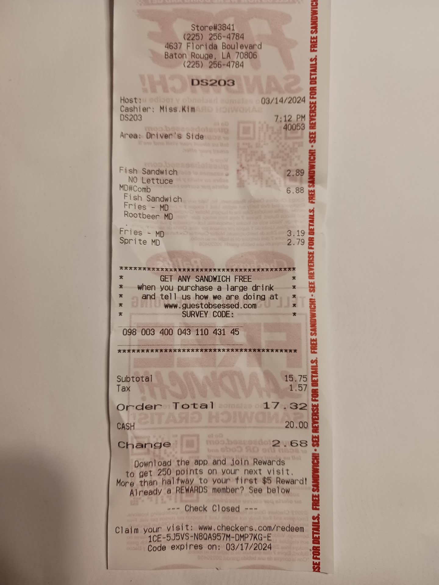 Read moreThe wait time in the drive-thru wasn't that long considering so I was happy about that. However, the lady over the intercom, the receipt says the cashier was Taylor, needs to learn to talk before getting back to that position. Placing the order was not the problem but when she repeated what I ordered, she spoke 50 million words in 2 seconds. I know that's an exaggeration but she was talking that fast I couldn't make out anything she said and I knew what I ordered. I asked her to slow down and repeat what I said, she didn't but the only thing that I understood was a total price and that was the last thing she said. After I was giving my food, I told the gentleman at the window "whomever was on the mic need to go". He didn't seem a bit concerned or cared about what I said. All the other Checkers and Rally's I've stopped at throughout my lifetime, my burgers have always been great. Today it didn't...