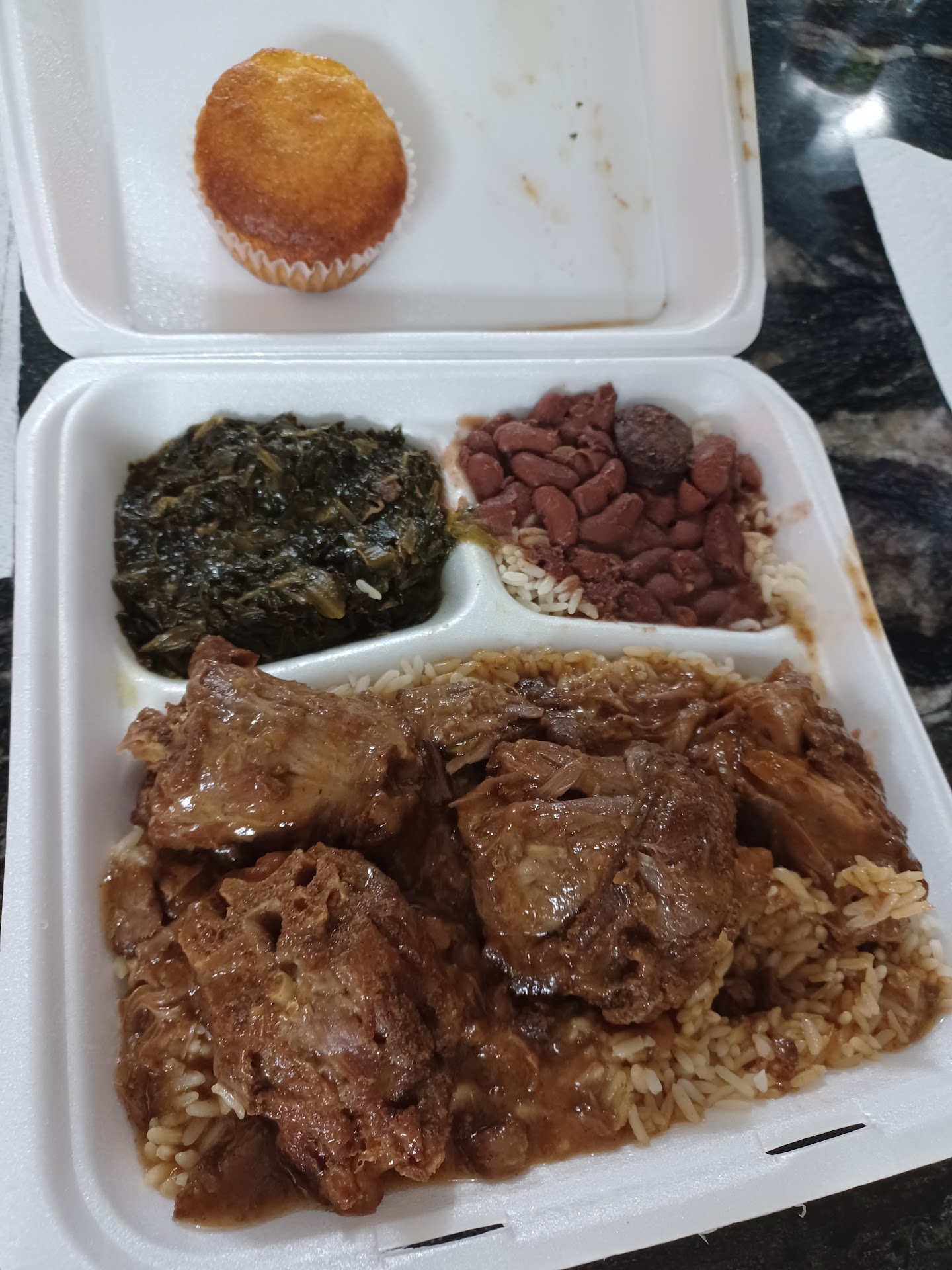 Drove down from TX to visit family and it was suggested we try this place. Your main entree cones with rice and gravy BUT you get to choose two additional sides. I got the turkey necks as my main entree with Mac n cheese and red beans n rice as my sides. My mom got the same entree but her sides were mustard greens and red beans n rice. The menu is different each day besides being able to get fried chicken which we did not try. The turkey necks, rice n gravy was soooo good. Seasoned well and very filling- a lot of food and worth evry cent. I wasn't a fan of the red beans n rice, but my mom liked it especially the meat in it she said and she also liked the mustard greens. The Mac n cheese was good. Never had it made with spaghetti noodles! Oh yeah you also get a corn bread muffin too! The plate was $11.95. They also offered oxtails that day for $21.95. I would definitely go back and make sure to get a plate to bring back to TX. I sure did hate they were closed on Sunday...lol. We called in the order to avoid waiting as we were told that the line could be so long out the door. The staff was friendly and the food was still hot. I think we went that evening sometime after 5 so the line started to form once we arrived and were in line. If you haven't tried this...