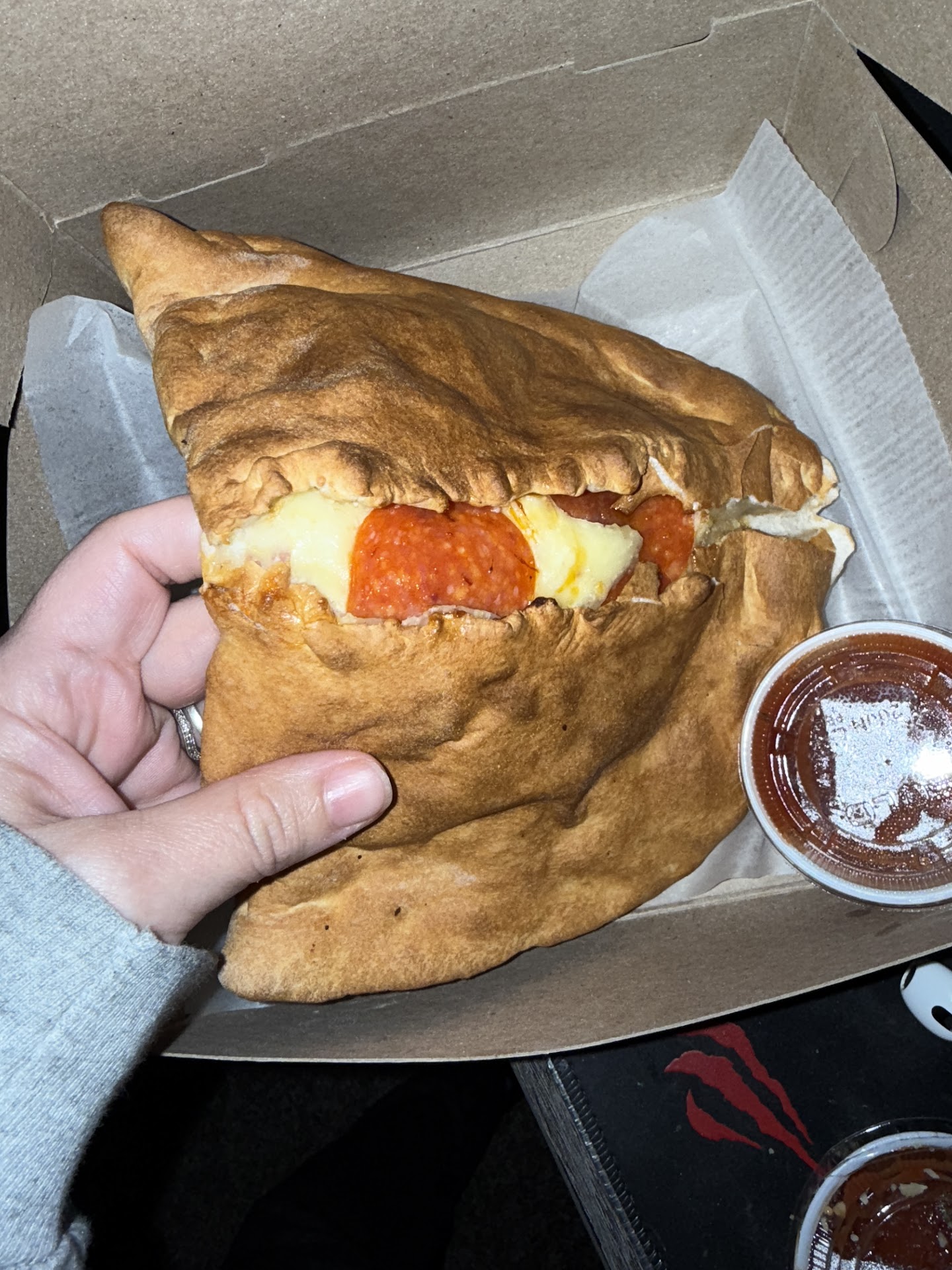 Read moreDon't make the mistake of not reading the reviews before you bother wasting your money here LOL thankfully I did not ingest anything but my poor boyfriend loves calzones so he wanted to try. and had so much stomach issues the next day from a mediocre waste of money. The employees also do not understand anything about what you ask for. Not sure if you're supposed to be able to customize or not but it would seem not. He ordered one of the menu items and asked to simply add ricotta cheese to it and they said they already had a mix. I've also never seen a calzone look like this it's kind of un appetizing but bring your own utensil bc you'll see it. If they manage to find one they are super thin and won't work on the heavy blazing hot calzone. It is soft and sloppy not one that you can pick up like other places. Very tiny walk-up spot tables outside are very dirty. My boyfriend's stomach was rolling for over 24 hours making all kinds of audible noises. I ate at a great Greek place a couple exits away after we left and was absolutely fine. The Yelp reviews on this place are all...