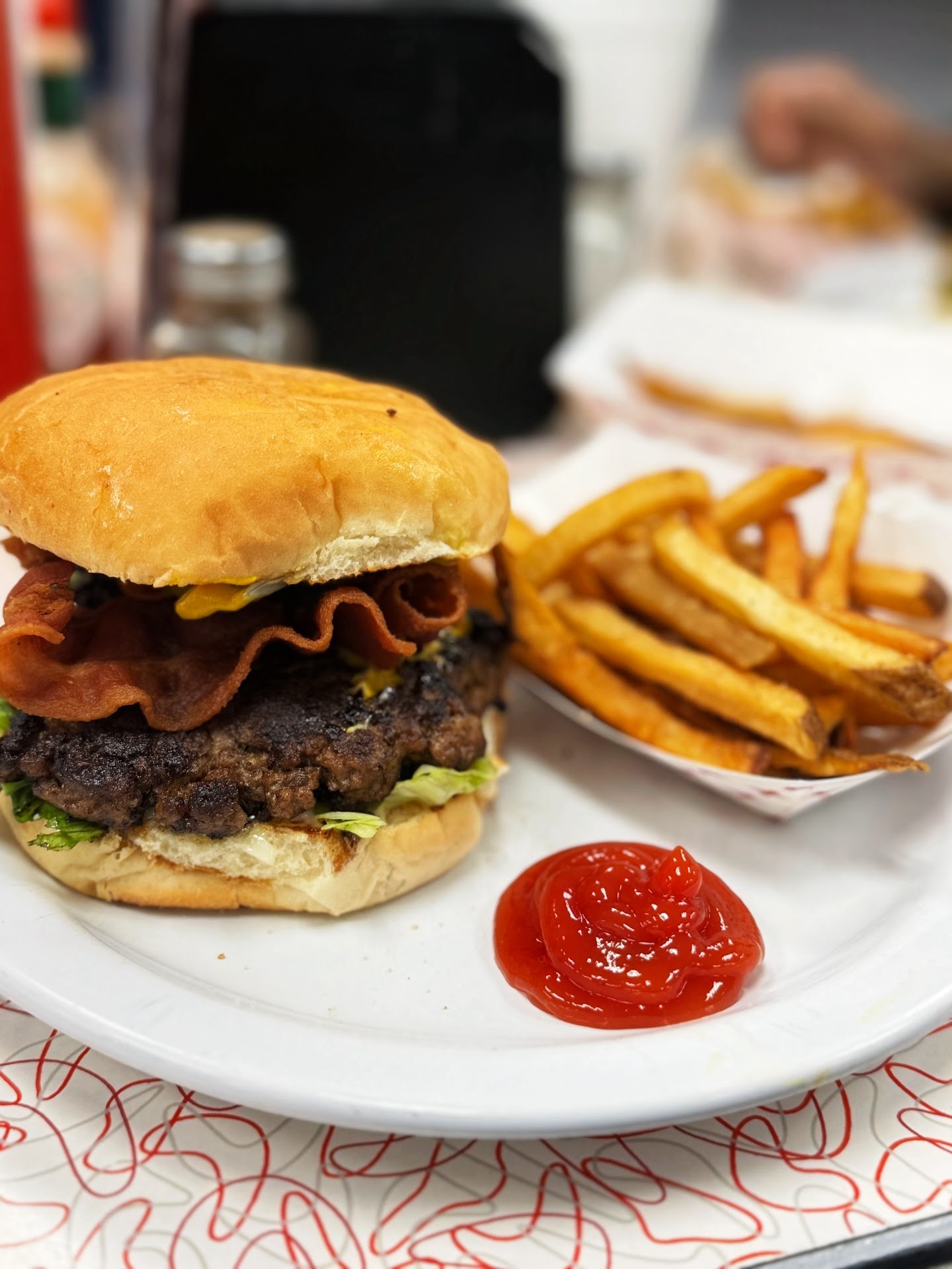 The burgers are good but not great—at least for someone like me who prefers burgers cooked to temperature. Dearman’s serves their patties well-done by default, and I didn’t think to ask if they’d make it to order. I had a regular hamburger (no cheese) with bacon, and while it was tasty, it didn’t quite wow me. I’m a purist when it comes to burgers and felt like the patty could have been more of a standout.