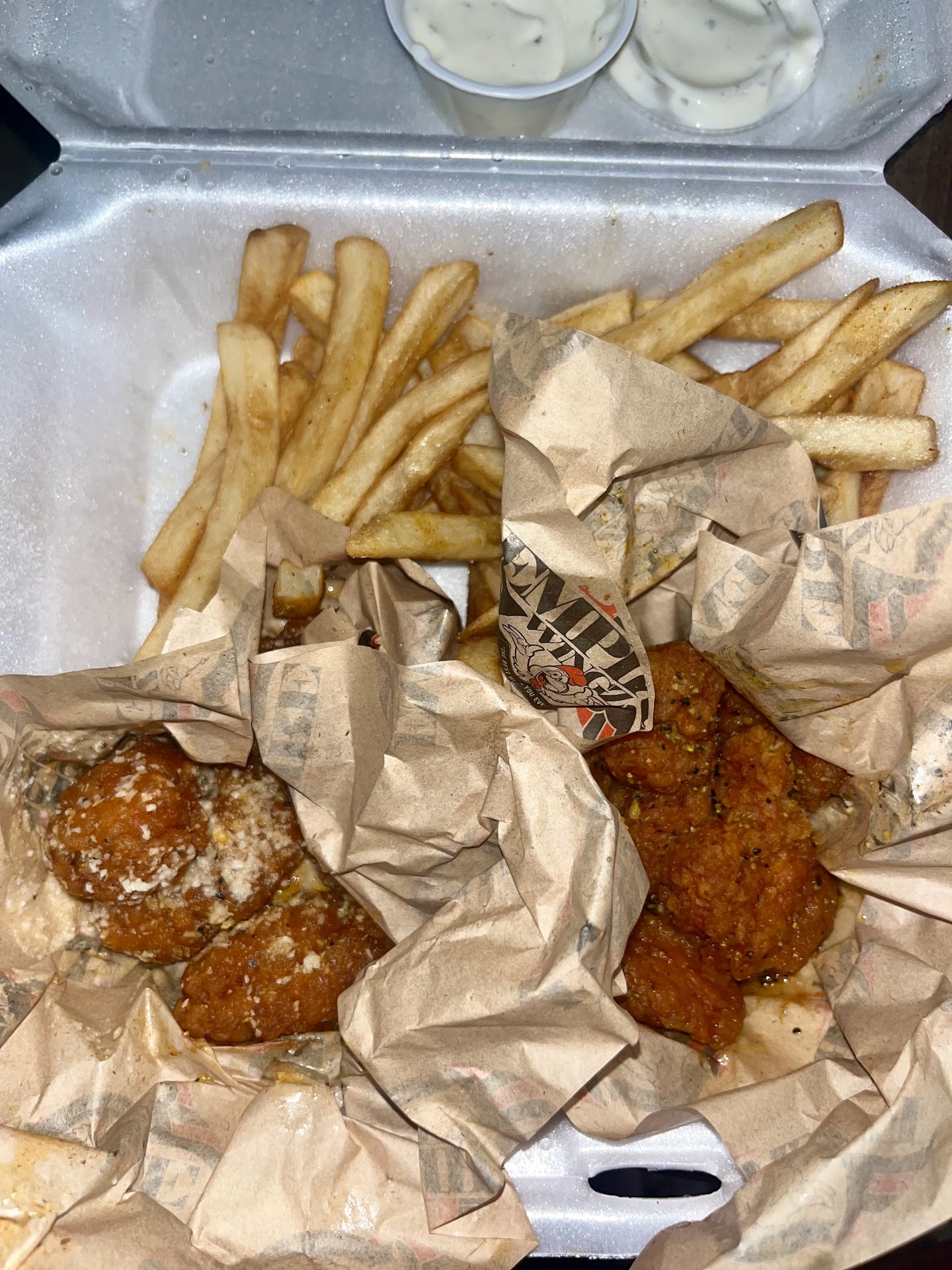 Just picked up 20 wings and fries. I had to go with a few different sauces so I could get a taste of everything. Let’s start with the employees... the lady that was taking the orders was nice and the guys cooking/preparing the food seemed to be very on task and doing a solid job. My order came out exactly how I ordered it, which is always a plus. The fries weren’t anything special, but they definitely weren’t bad. The wings weren’t huge, but they were some pretty solid sized wings. I tried the garlic parmesan, spicy lemon pepper, sweet heat, and spicy bbq sauces. All of these sauces were good, but the spicy versions of the regular sauces just seemed like they mixed some hot sauce in. It seemed to overpower the actual flavor, but they were still good. This was probably my only complaint, but it could just be my preference. The wings had the perfect amount of kick without burning my mouth, but they do have a danger sauce I’d like to give a try. My favorite part of the experience was that perfect crisp on the outside of the wing that many wing places can’t seem to do. Also, the wings were tossed in the perfect amount of sauce instead of just kinda slathered on as I’ve seen at other places. Absolutley recommend this place and I will definitely be back. Hopefully we’ll see more sauce selections in the future, but I’m...