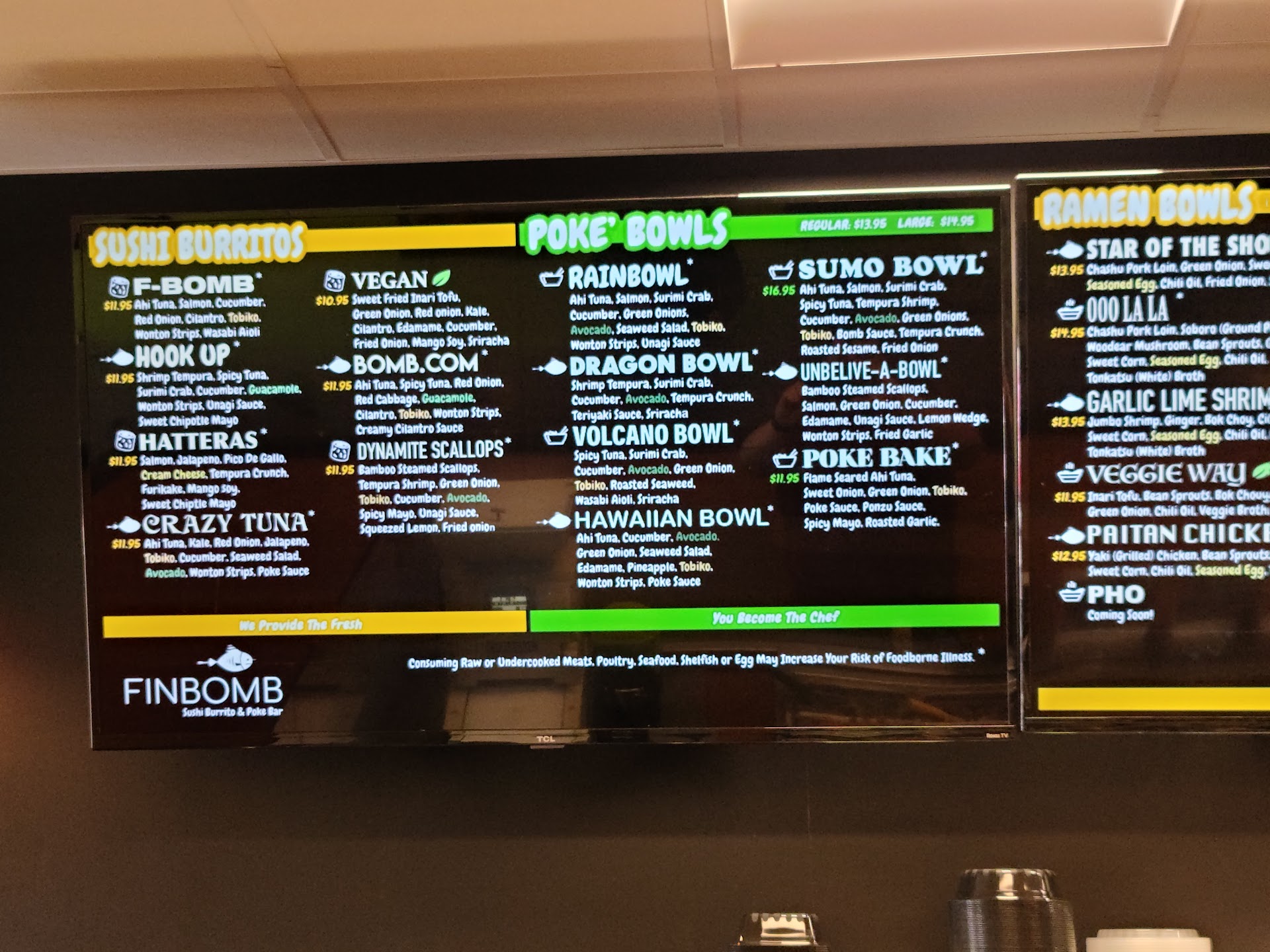 Read moreFinbomb is "THE BOMB"!! I love this place! I eat there 2-3 times a week when I'm in town. I typically create my own bowl. I love the purple rice option.Try the purple rice in your bowl! Their meats, seafood and other proteins are always fresh and delicious. Same goes for the vegetables and other toppings. While I like the bowls, they have awesome ramen choices too. I've heard the burritos are also really good. They even have Miso soup and egg rolls!!! I love those as well. The egg roll dipping sauce - WOW!!