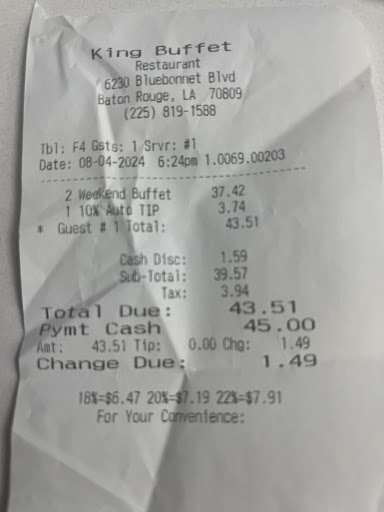 China Bear down the street has far superior food, both in quality and taste, and I've never had a poor experience there. I only chose King Buffet because China Bear does not have a buffet in the evenings.