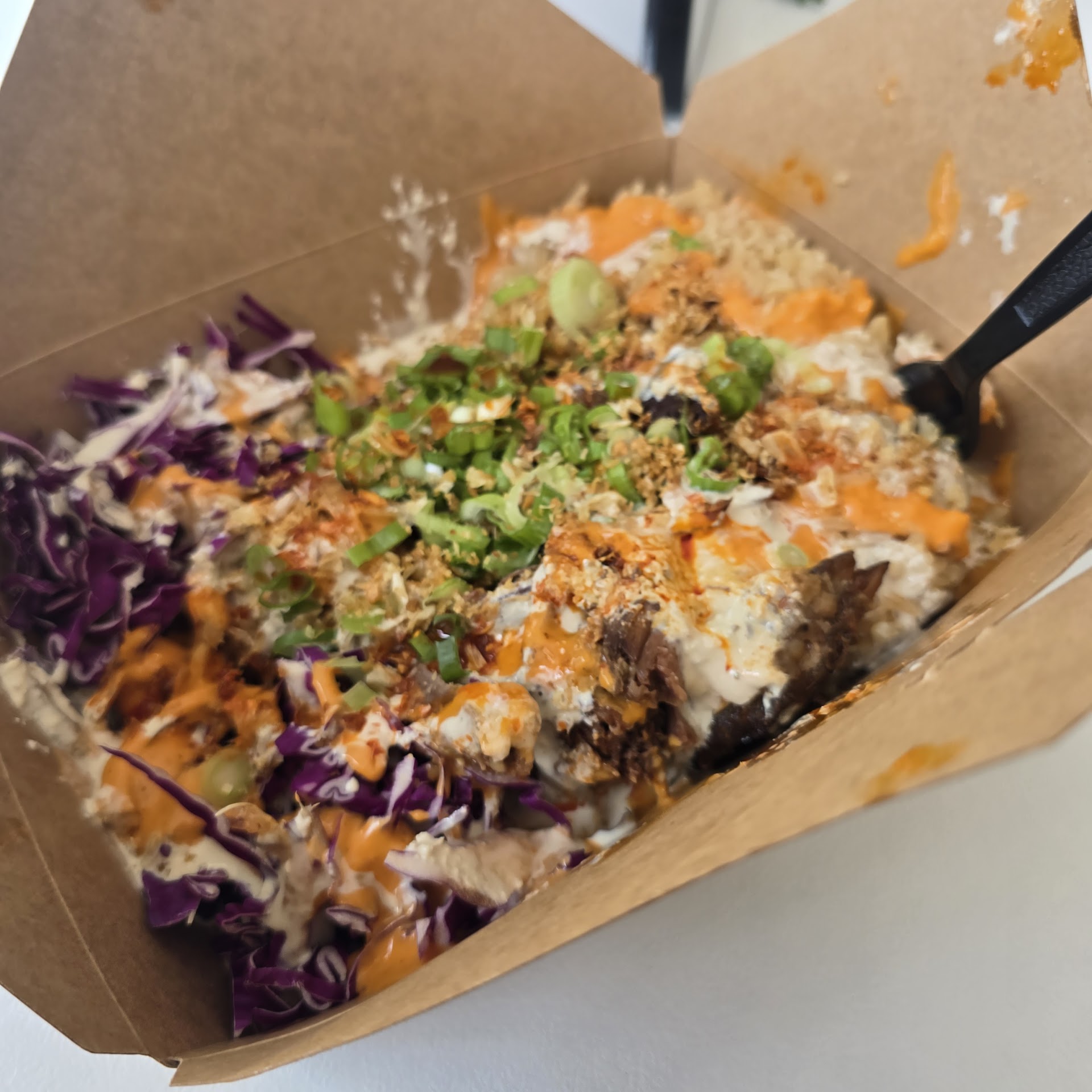 This place is phenomenal. The food was outrageous. The taste was superb I honestly dont have the words to describe how good this place is. So you walk in and the decor is pretty cool very asian fusion anime inspired. The way it works is you pick your protein. Idk if the menu changes but they had braised beef (🤤🤤) shrimp or chicken. I got the braised beef but the shrimp and chicken looked great. You pick if you want rice or sweet potatoe noodles the noodles looked wild cause they are see through but we're incredible. Then the veggies, I tried the kimchi slaw not my favorite just wasn't for me. The sauce is what really brought oit the dish I had the soul sistas and the Ot. Which the young lady recommended and she did not disappoint. I cant recommend this place enough. It's nestled in down blink and you can miss no real signage or anything that really catches the eye except for a sandwich board sign outside. The seating is very lifted maybe about 4 tables so get there fast and enjoy. I paid 20.69 I believe because I got a water a and topo Chico with mint and...