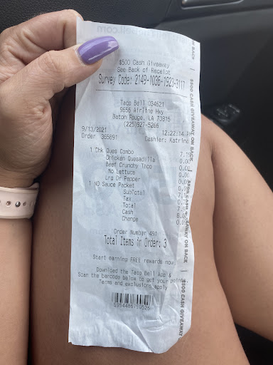 Read moreMy girlfriend and I went to taco Bell and ordered a nacho fry box and 2 beef burritos, and a chicken taco . We waited in line for some time and got our order , after driving almost home I inspected the bag and one of the burritos was missing so we went back to the restaurant, and there was a line wrapped around the building . So we waited in line no big deal to get the missing burrito there was no receipt in the bag at all. I explained that to the drive thru employee , and she said that there was nothing she could do without the receipt. I explained that we didn't receive a receipt. She basically insisted that we were lying . It was a different person at the window. She refused to give me the item that I paid for , and failed to acknowledge that any mistake was made. This isn't hassle free customer service. I would really really appreciate getting my burrito , or my money back on the grounds that it's basically theft , and incompetent employees need training or to be replaced. I would appreciate an apology at the very least. Thanks...